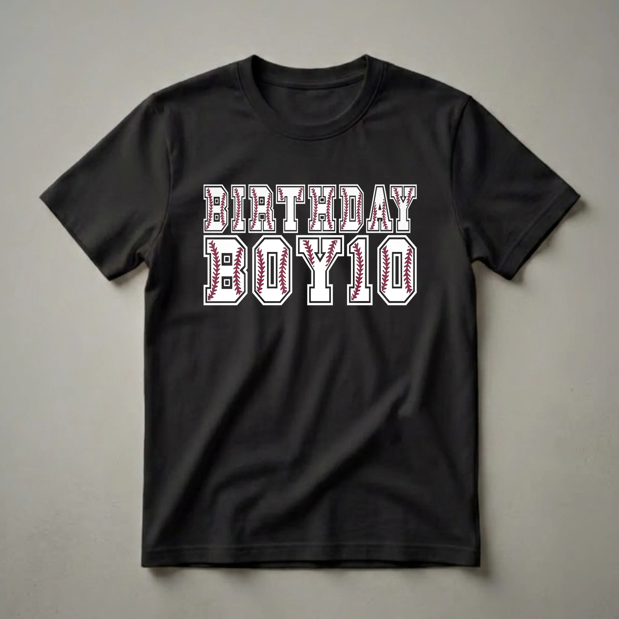 Ten years old is a significant milestone, and this baseball-themed birthday shirt captures the excitement for any young player turning a decade old. The design prominently features the words "BIRTHDAY BOY 10" in a bold, collegiate-style font. Each letter is intricately filled with the iconic stitching pattern of a baseball, complete with the maroon laces against a crisp white background, all outlined in black and white for a classic athletic look. This graphic tee is a fantastic way for a 10-year-old boy to showcase his love for America's favorite pastime on his special day. Baseball is a sport deeply ingrained in American culture, with a rich history dating back to the 19th century. This shirt is well suited for a young athlete who spends his weekends on the diamond, practicing pitches and hitting home runs. It makes a thoughtful gift for a son, grandson, nephew, or any young baseball enthusiast celebrating his tenth birthday. Imagine him wearing this t-shirt to his birthday party, a baseball game, or even just out and about, proudly displaying his age and passion. This shirt is a go-to for any birthday celebration, offering a fun and sporty way to mark the occasion.