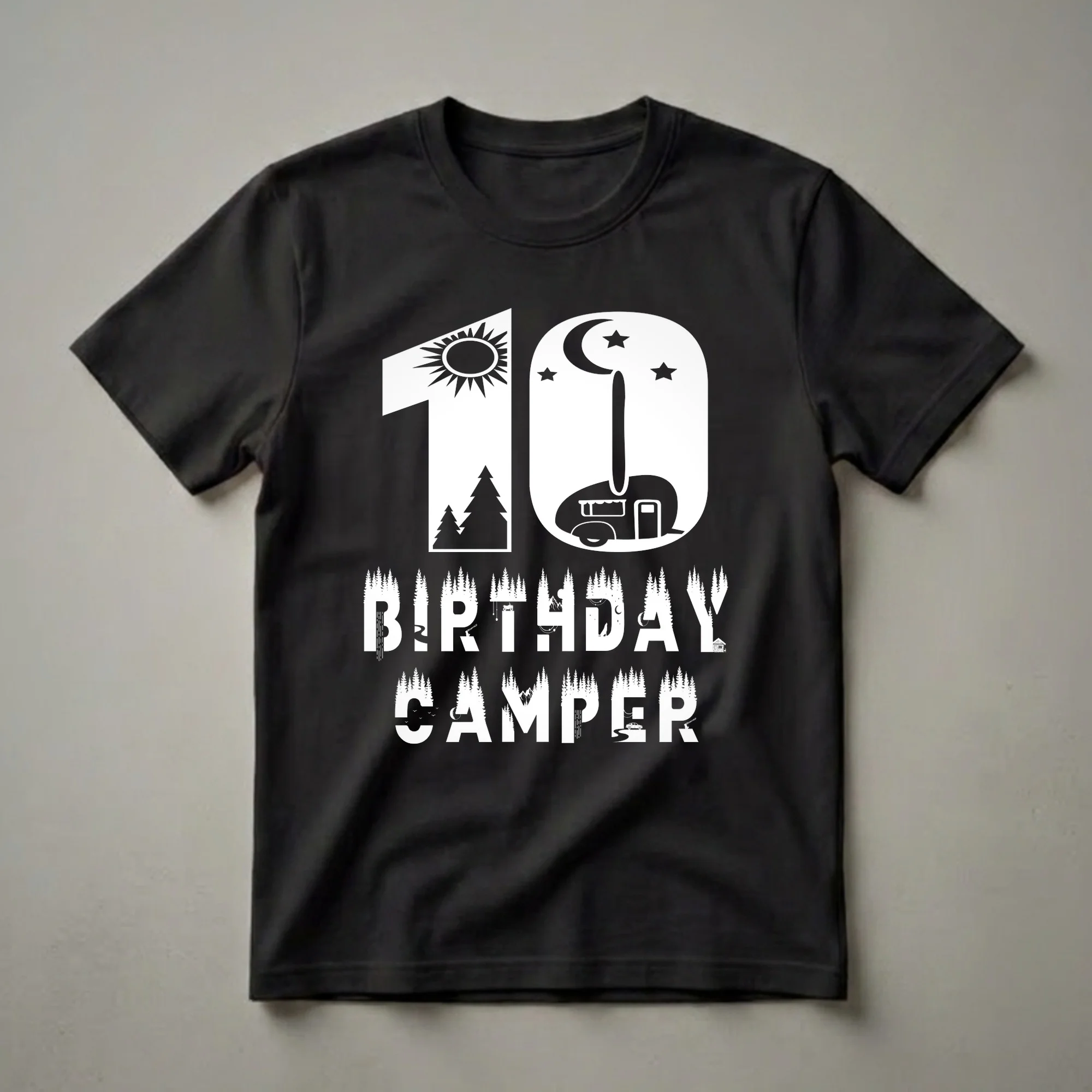 Ten-year-olds embarking on their second decade will love this "10th Birthday Camper" t-shirt. The graphic showcases a bold "10" integrated with a sunny sky, silhouetted pine trees, and a classic camper trailer under a starry night sky with a crescent moon. Below, the words "BIRTHDAY CAMPER" are creatively formed by a dense forest landscape, complete with a waterfall, a winding river, a lone wolf howling at the moon, a small cabin, an ATV, and a car driving on a road. This tee is a thoughtful gift for any child turning ten who dreams of adventure in the great outdoors, loves camping trips, or enjoys exploring national parks. It's a fantastic way for a 10-year-old to express their passion for nature and celebrate a significant birthday milestone. This shirt is great to wear to a birthday party, a camping trip, or just for everyday wear, making them feel like a true explorer.