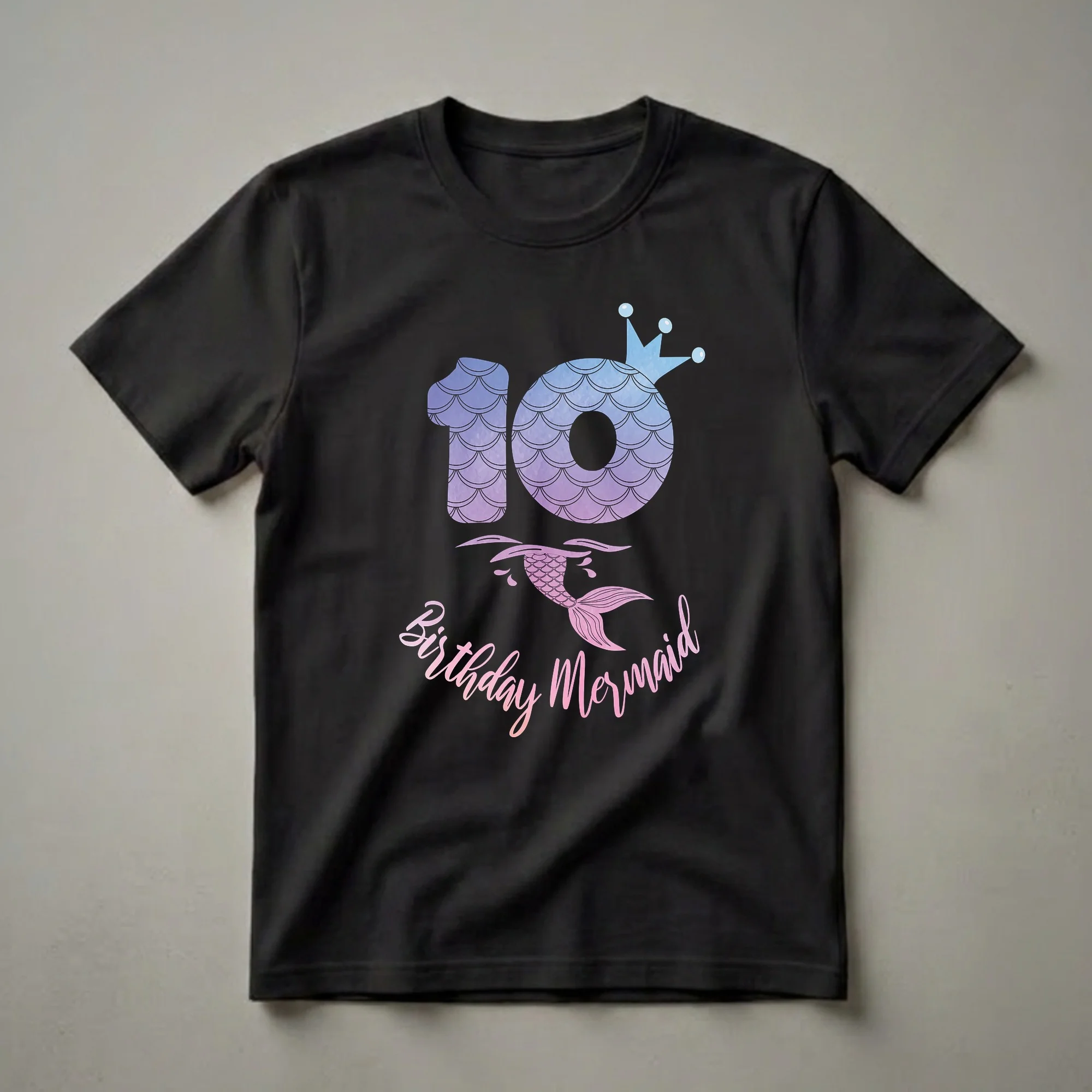Ten years old is a milestone, and this birthday mermaid tee captures the magic of turning double digits. The graphic showcases a large number '10' filled with a gradient of blue and purple scales, reminiscent of a mermaid's tail. Topping the '10' is a delicate blue crown with three shimmering pearls, signifying royalty and celebration. Below the number, a stylized mermaid tail emerges from wavy water lines, rendered in soft pink and orange hues. The words 'Birthday Mermaid' are written in a flowing, script font that complements the whimsical theme. This t-shirt is a wonderful way for any girl to express her excitement for her tenth birthday. It's a thoughtful gift for a daughter, niece, or granddaughter who dreams of mermaids and the ocean. She will reach for this shirt to wear to her birthday party, school, or any casual outing where she wants to show off her special age. The design is eye-catching and celebrates the transition into a new chapter of childhood.