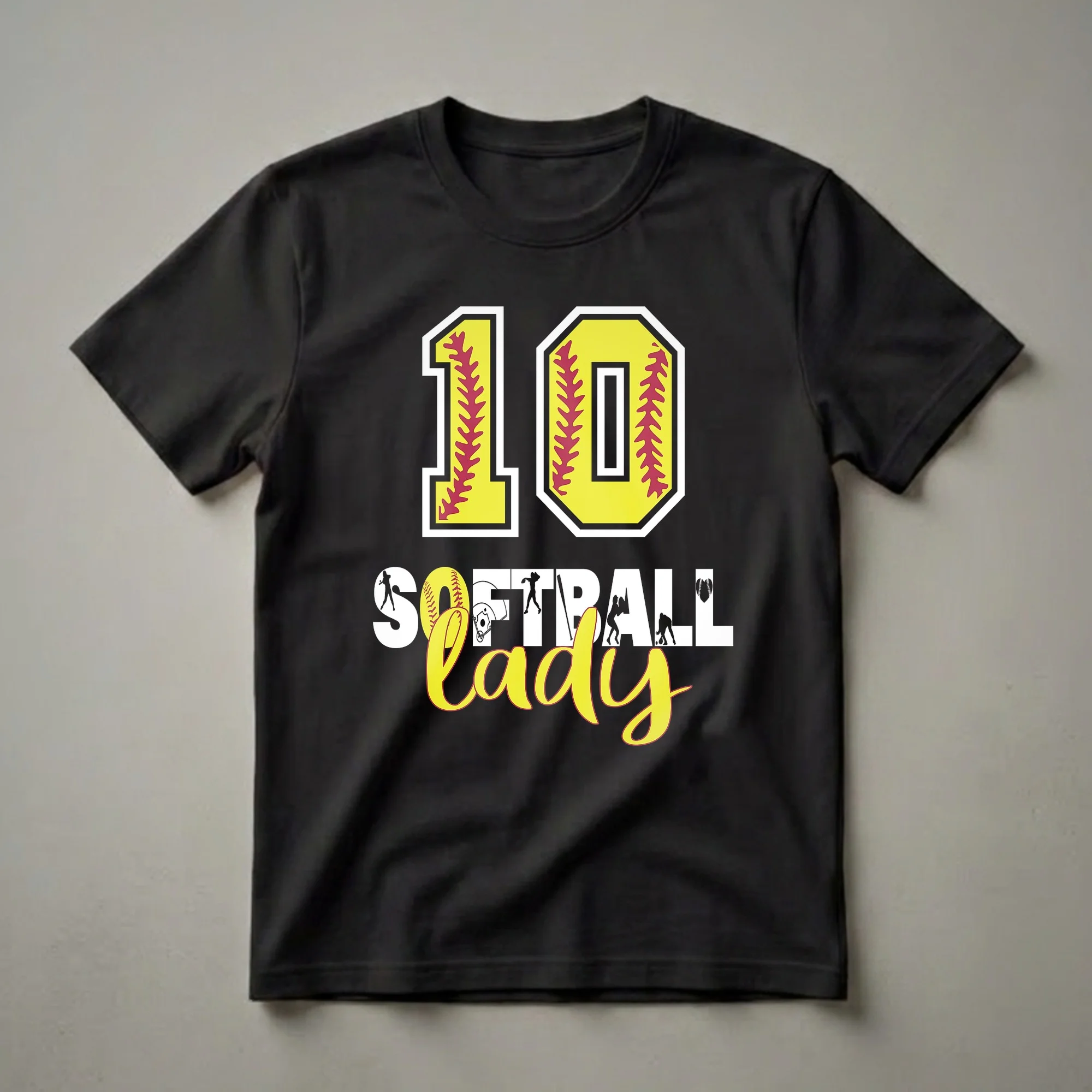 Ten years old is a significant milestone, and this 'Softball Lady' t-shirt captures the excitement for any young athlete celebrating their tenth birthday. The design prominently features the number 10, creatively styled with the iconic yellow and red stitching of a softball, making it instantly recognizable to any player or fan. Below the large number, the words 'Softball Lady' are presented in a playful, script font, accented by a vibrant yellow outline. Integrated into the design are dynamic silhouettes of softball players in action, a batter swinging, a pitcher throwing, and fielders ready to make a play. A baseball glove, a baseball bat, and a softball heart graphic further emphasize the love for the sport. This tee is a fantastic way for a 10-year-old girl to showcase her passion for softball on her special day. It makes a thoughtful gift for any young player who lives and breathes the game, whether she's just starting out or has been playing for years. She will reach for this shirt to wear to birthday parties, team events, or just for casual outings, proudly displaying her age and her favorite sport. This shirt is a staple for any young softball enthusiast celebrating a double-digit birthday.
