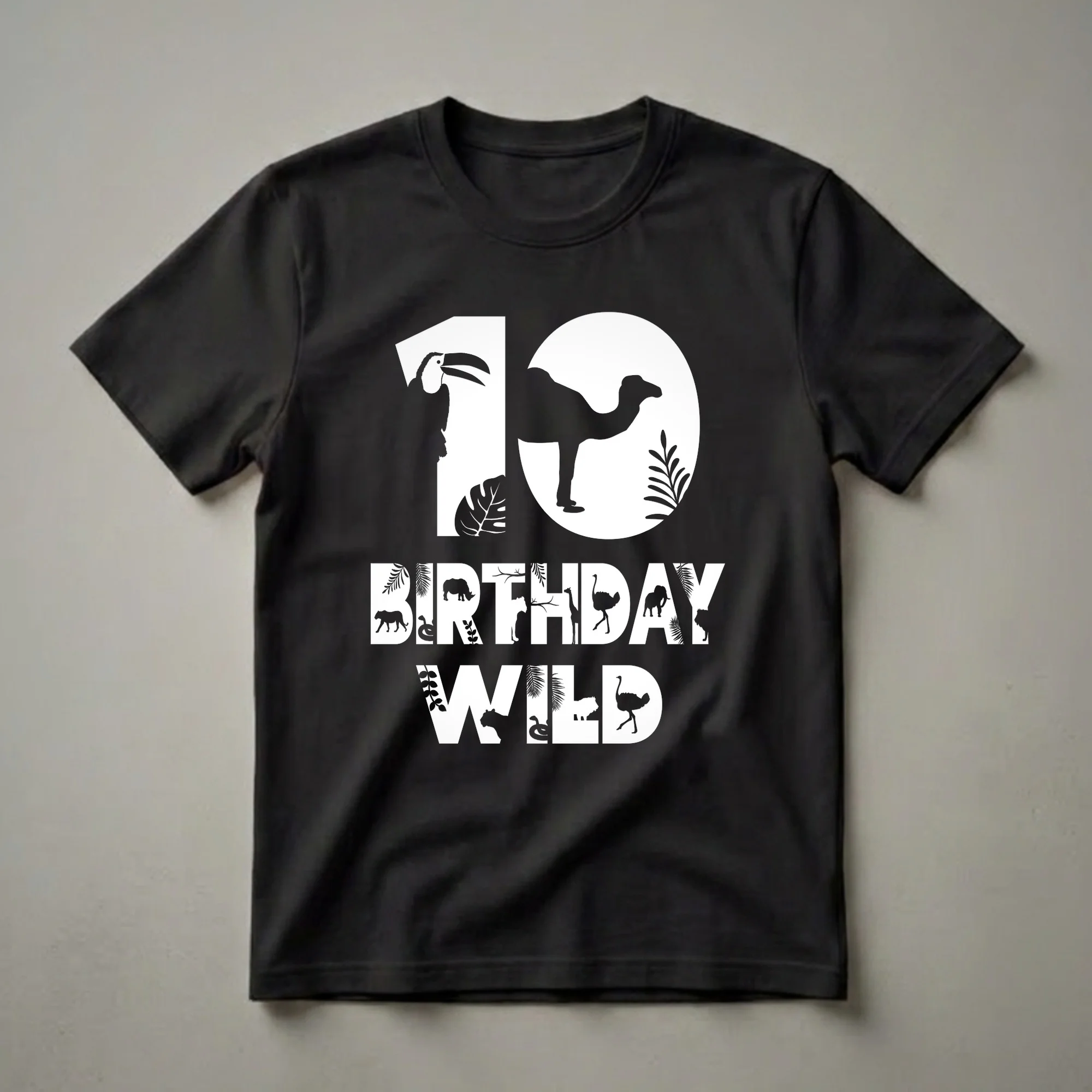 Ten years old is a milestone, and this 'Wild Kid' birthday tee captures the excitement of turning a decade old with a vibrant zoo theme. The graphic features the number '10' creatively formed by a toucan and a camel silhouette, surrounded by tropical leaves. Below, the words 'BIRTHDAY WILD' are integrated with a menagerie of safari animals, including a tiger, rhinoceros, snake, lion, giraffe, elephant, and ostriches. This shirt is a fantastic way for any 10-year-old boy or girl to showcase their adventurous spirit on their special day. It's a thoughtful gift for a child who loves animals and dreams of safaris or visiting the zoo. Imagine them wearing this eye-catching t-shirt to their birthday party, a zoo trip, or even just for everyday fun. This unique birthday shirt is sure to be a hit, making their tenth birthday celebration even more memorable. It's a go-to tee for any young explorer ready to embrace their wild side.
