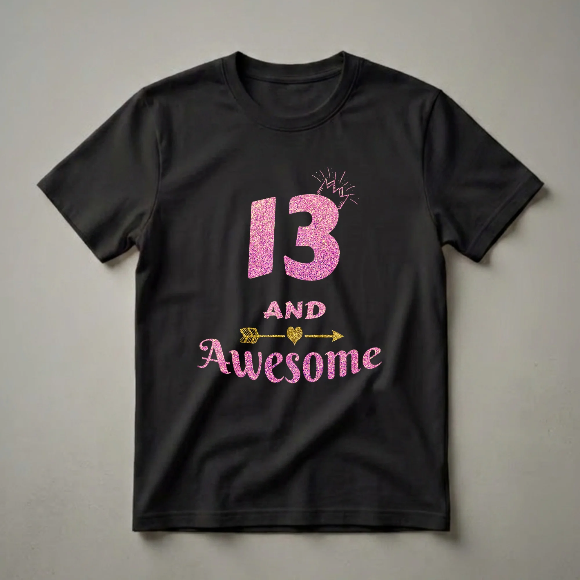 Turning thirteen marks a significant transition into the teenage years, a time of newfound independence and self-discovery. This eye-catching graphic tee celebrates that milestone with a vibrant design. The number '13' is prominently displayed in a shimmering pink glitter font, topped with a whimsical, hand-drawn crown that sparkles with pink and purple hues. Below the number, the phrase 'AND Fabulous' is written in a stylish script, also featuring a dazzling pink glitter effect. Accompanying the text is a golden glitter arrow piercing a golden glitter heart, symbolizing direction and love. This t-shirt is a fantastic way for any girl to express her excitement about becoming a teenager. It's a thoughtful gift for a daughter, niece, or granddaughter celebrating her 13th birthday, making her feel special and celebrated. She will reach for this tee to wear to her birthday party, family gatherings, or just to show off her new age with pride. This shirt is a staple in any tween's birthday wardrobe, offering a fun and stylish way to commemorate this special occasion.