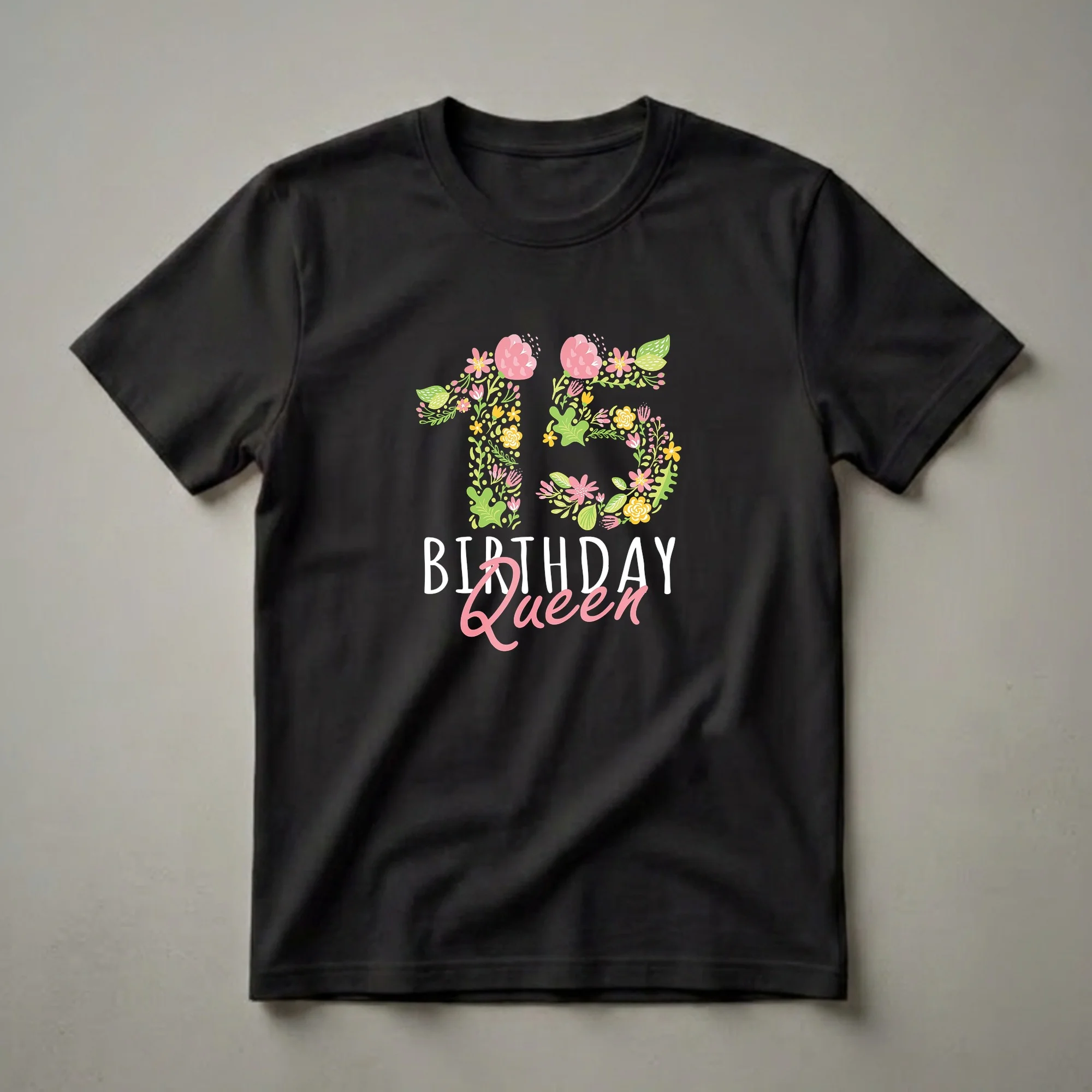 - Celebrate her 15th birthday with this floral 'Birthday Queen' tee, featuring a vibrant '15' graphic.
