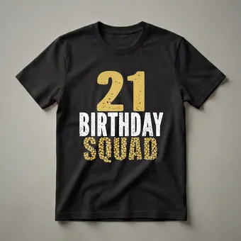 - "21st Birthday Squad" graphic tee for women and men.