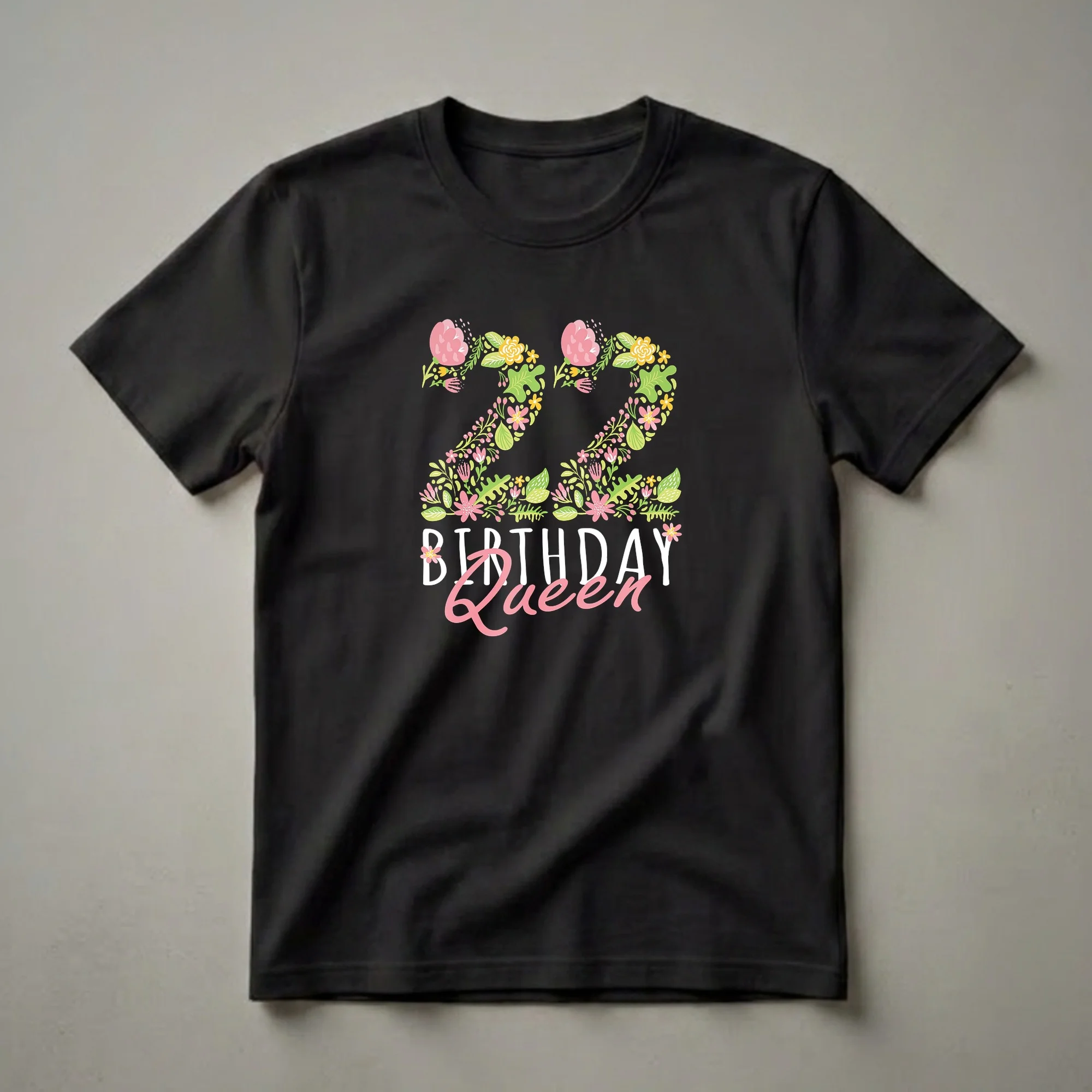 This black t-shirt showcases a vibrant floral design that artfully forms the number '22'. Delicate pink and yellow flowers, along with lush green leaves and berries, create a whimsical and celebratory look. Below the floral '22', the words "BIRTHDAY Queen" are displayed in bold white lettering, with "Queen" written in a stylish pink script. This graphic tee is a wonderful way for a woman to celebrate her 22nd birthday, marking a significant milestone as she enters her early twenties. The floral motif adds a touch of feminine charm, making it a standout piece for any birthday celebration. This shirt is a thoughtful gift idea for any woman turning 22, whether it's from a parent, sibling, or friend. She can wear this fun and festive shirt to her birthday brunch, dinner party, or any casual gathering with loved ones. It's a cheerful reminder of her special day and a stylish addition to her wardrobe, embodying the spirit of a queen on her birthday.