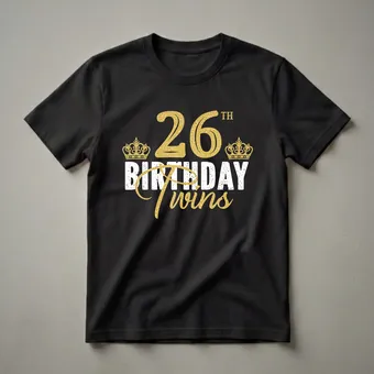 Twin brother and sister celebrating their 26th birthday will reach for this striking graphic tee. The design features a bold '26' in a textured gold glitter, with 'TH' positioned above it. Below, 'BIRTHDAY' is written in distressed white block letters, with 'Twins' elegantly scripted in matching gold glitter. Two ornate gold crowns flank the 'BIRTHDAY' text, adding a regal touch. This shirt is a thoughtful gift for any pair of twins marking their 26th year, a significant milestone as they transition further into their mid-twenties. It's a great way for them to showcase their special bond and shared birthday. Wear this t-shirt to birthday dinners, parties, or casual gatherings to celebrate this momentous occasion together. It's a staple in any twin's birthday apparel collection.