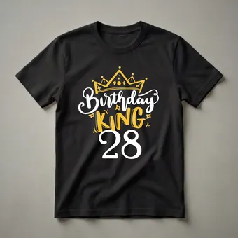 Turning 28 marks a significant milestone, and this 'Birthday King' t-shirt is a bold way for any man to celebrate his special day. The design features a striking golden crown, symbolizing royalty and achievement, positioned above bold, stylized lettering that proclaims 'Birthday KING' in a vibrant yellow. Below this, the number '28' is prominently displayed in a clean white font, clearly indicating the age being celebrated. This graphic tee is a fantastic choice for the man who enjoys being the center of attention on his birthday. It's a thoughtful gift for a son, brother, or friend who is turning 28 and wants to make a statement. Imagine him wearing this shirt to his birthday party, brunch, or any celebratory gathering. The striking contrast between the gold and white elements against a dark background makes this shirt eye-catching and festive. This shirt is a fun way to commemorate reaching this age and embracing the title of 'King' for the year ahead. It's a staple for any birthday celebration wardrobe.