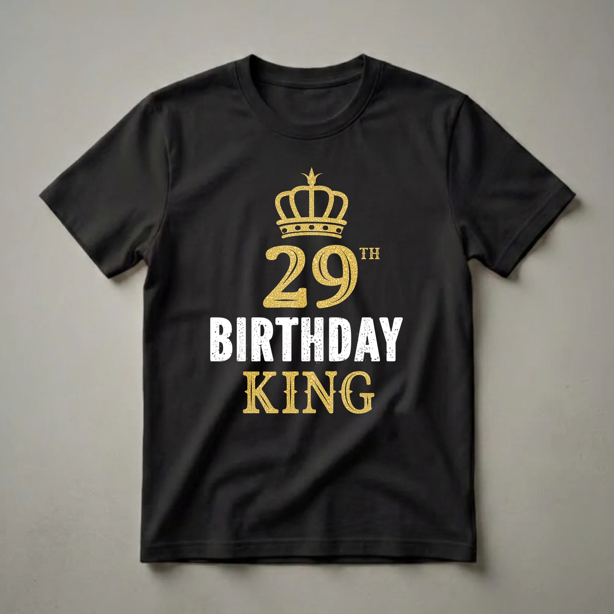 Celebrate your 29th birthday like royalty with this bold graphic tee proclaiming you the undisputed king of your epoch. This '29th Birthday King' t-shirt is worn by the man celebrating this special occasion. The graphic features a regal golden crown positioned above the number 29, rendered in a textured, glittering gold effect. Below the number, the words 'BIRTHDAY KING' are displayed in a distressed white font, creating a striking contrast against a black background. This tee is a fantastic way for the birthday boy to announce his arrival into his late twenties with confidence and style. It's a thoughtful gift for any man turning 29, whether it's for a birthday party, a casual get-together, or just to wear as a statement piece throughout his birthday week. This shirt works well for men who appreciate a bold, celebratory design. Imagine him wearing this t-shirt to his birthday dinner or a gathering with friends, feeling like the king of his special day. It's a staple in any birthday collection for those entering their thirtieth year.