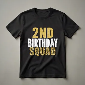 Two-year-olds are entering a vibrant stage of discovery and play, making their second birthday a milestone worth celebrating with fun apparel. This graphic tee proudly declares '2ND BIRTHDAY SQUAD' in bold, eye-catching letters. The number '2' and the word 'SQUAD' are filled with a textured pattern of shimmering gold circles, resembling confetti or bubbles, while 'BIRTHDAY' is presented in a distressed white font, creating a striking contrast against a black background. This shirt is a thoughtful gift for any two-year-old boy or girl who is ready to join their birthday party crew. It’s the perfect t-shirt to wear for a birthday celebration, whether it's a small family gathering or a larger party with friends. The design captures the excitement of turning two, a significant age as toddlers begin to express more independence and curiosity about the world around them. This apparel makes a memorable keepsake from a special day, ensuring the birthday child feels like the star of their own squad. Imagine the joy on their face as they wear this festive shirt, ready to enjoy cake, games, and presents with their loved ones.