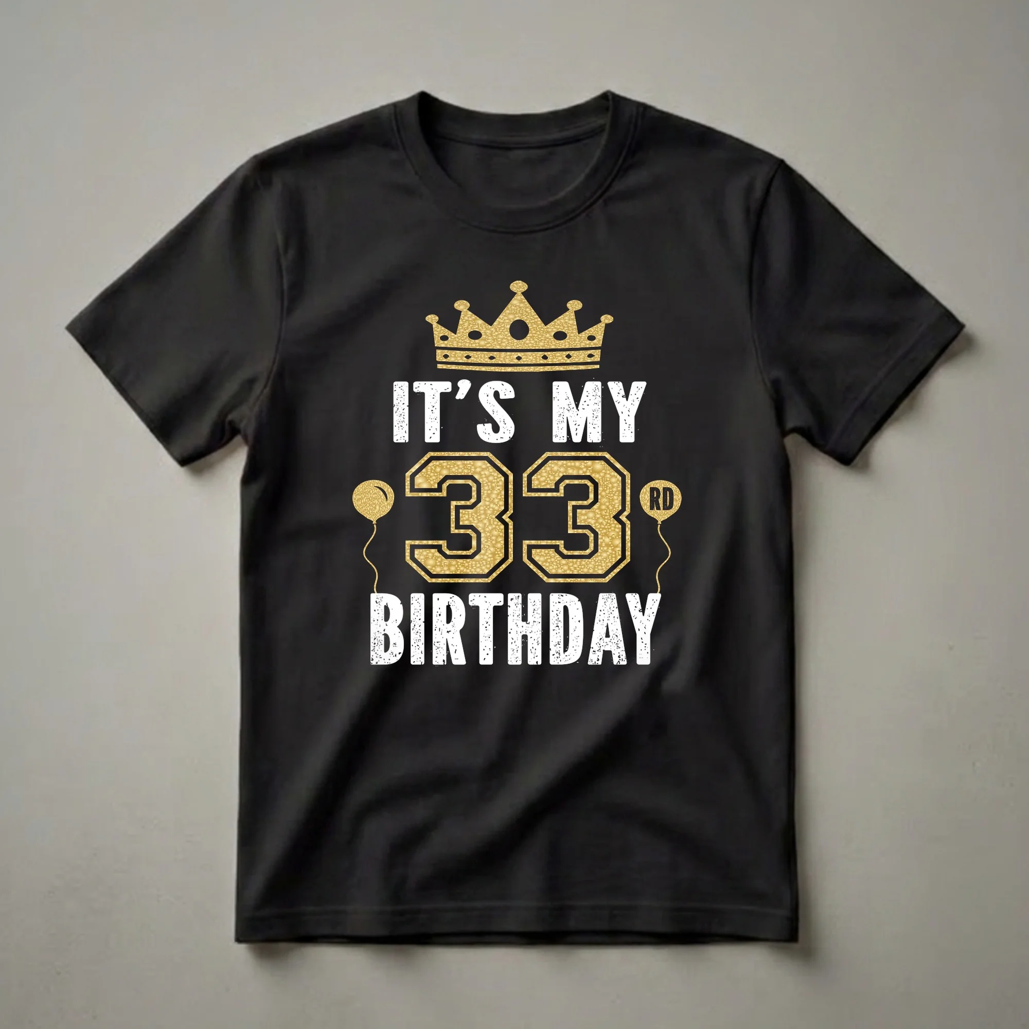 Turning 33 marks a significant milestone, a blend of established adulthood and continued vibrancy, and this graphic tee captures that celebratory spirit. The design prominently features a regal golden crown, symbolizing royalty and achievement, positioned above bold, distressed white text that reads 'IT'S MY'. Below this, the number '33' is rendered in a striking, textured gold, exuding a sense of luxury and importance. Accompanying the number are two golden balloons, one on each side, adding a festive touch. The word 'BIRTHDAY' is displayed in distressed white capital letters at the bottom, completing the celebratory message. This t-shirt is a fantastic way for anyone turning 33 to express their joy and pride on their special day. It's a thoughtful gift for a man or woman who is celebrating this milestone birthday, whether it's for a birthday dinner, a party, or just a casual get-together. This shirt works well for the birthday individual who appreciates bold graphics and a touch of celebratory flair. Wear it to your birthday bash and let everyone know you're celebrating 33 years in style.