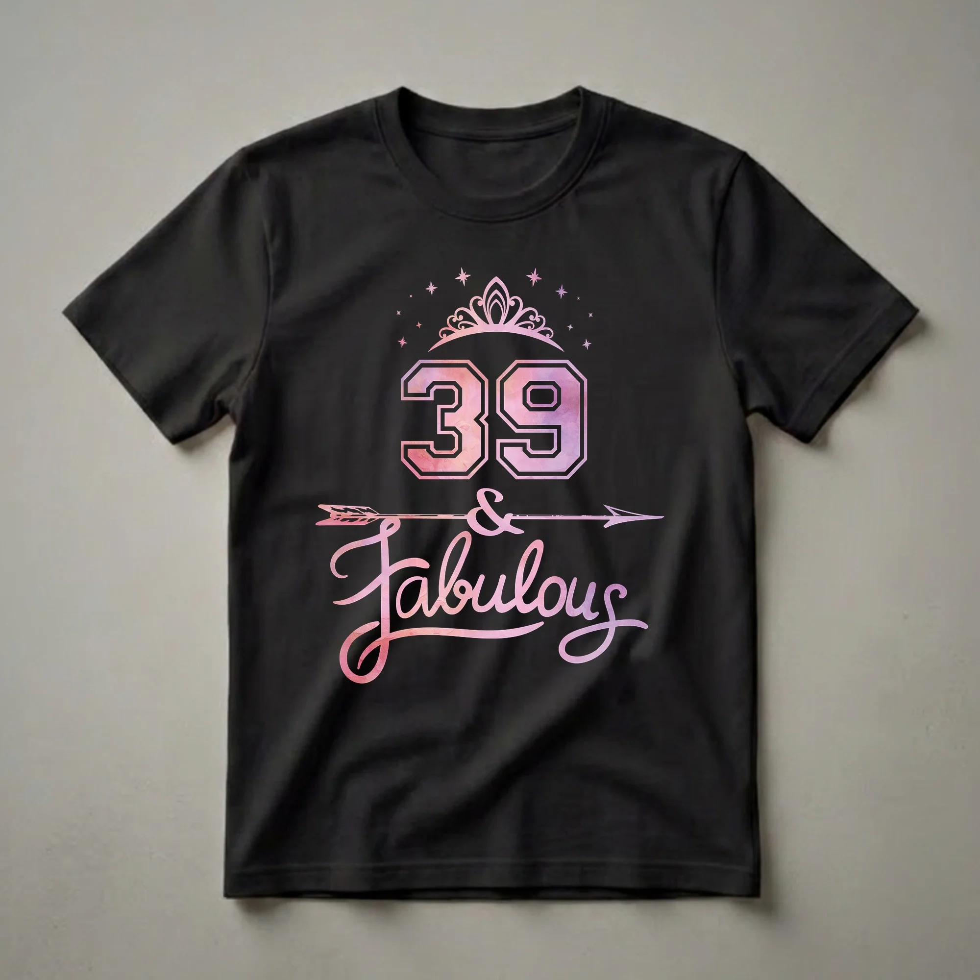 Turning 39 is a significant milestone, and this '39 & Fabulous' graphic tee is a vibrant way to celebrate. The design features a prominent '39' in a collegiate-style font, filled with a soft watercolor texture in shades of pink and purple, topped with a delicate tiara and scattered stars. Below the number, the phrase 'and Fabulous' is rendered in elegant script, accented by an arrow that passes through the ampersand. This eye-catching t-shirt is a staple for any woman celebrating her 39th birthday, whether it's a casual brunch or a festive party. It makes a thoughtful gift for a friend, sister, or partner who is embracing this exciting chapter. This shirt is a go-to tee for birthday celebrations and beyond, allowing the wearer to showcase their fabulousness with pride. Wear it to your birthday dinner or any event where you want to feel special and celebrated.