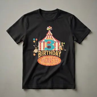 Three-year-olds are stepping into a world of imagination, and this circus-themed birthday tee is ready to join the celebration. The graphic showcases a vibrant, vintage-style circus tent adorned with red and white stripes, yellow stars, and a prominent teal number '3' signifying the special birthday. Flanking the tent are two cheerful monkeys, each holding a bunch of colorful balloons, adding a playful and energetic element to the design. Below the tent, the words 'BIRTHDAY RINGMASTER' are displayed in a bold, retro font, framed by an illuminated oval sign reminiscent of classic circus marquees. This t-shirt is a thoughtful gift for any child turning three who dreams of the big top and enjoys the excitement of a circus. It's great to wear to a birthday party, a family gathering, or just for everyday fun, making any three-year-old feel like the star of the show. The playful design and circus motif capture the wonder and excitement of childhood birthdays, making this shirt a memorable keepsake for the special day.