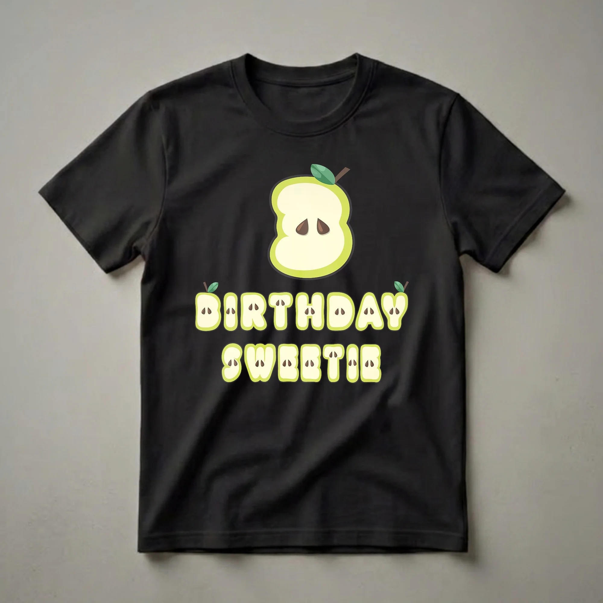 Three-year-old girls will adore this charming apple-themed birthday tee, celebrating their special day with a playful design. The graphic features a large, stylized slice of a green apple, with its seeds artfully arranged to form the number '3'. Below this, the words 'BIRTHDAY SWEETIE' are presented in a fun font, with each letter also designed to look like a slice of apple, complete with seeds. This eye-catching t-shirt is a delightful way to mark a third birthday milestone. Apples are a staple fruit, known for their crisp texture and sweet or tart flavors, and this design brings that fresh appeal to birthday apparel. This shirt works well for a 3-year-old girl's birthday party, whether it's a small family gathering or a larger celebration. It makes a thoughtful gift for any parent looking for a unique and festive outfit for their daughter's third birthday celebration. She will reach for this tee to wear to her party or for fun photos.