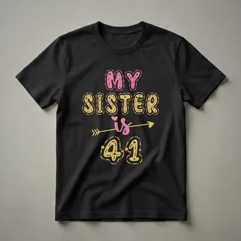 Turning 41 is a significant milestone, and this vibrant graphic tee is designed to celebrate your sister's special day. The design features the bold statement 'MY SISTER is 41' in a playful, bubbly font. The word 'MY' and the word 'is' are rendered in a sparkling pink, accented with small hearts and dashed outlines. The word 'SISTER' and the number '41' are presented in a dazzling gold glitter effect, complete with stars and dashed borders, creating a festive and celebratory look. An arrow graphic in gold pierces through the word 'is', adding a dynamic touch to the overall design. This t-shirt is a fantastic way for any sibling to show appreciation and celebrate their sister as she enters a new chapter. It’s a thoughtful gift idea for a sister who loves to stand out and embrace her birthday with style and fun. Whether she's celebrating with a quiet brunch or a lively party, this shirt is a go-to tee that she will reach for. It’s a perfect way to make her 41st birthday memorable and show her how much she is cherished. This apparel is a great conversation starter and a fun way to mark the occasion.