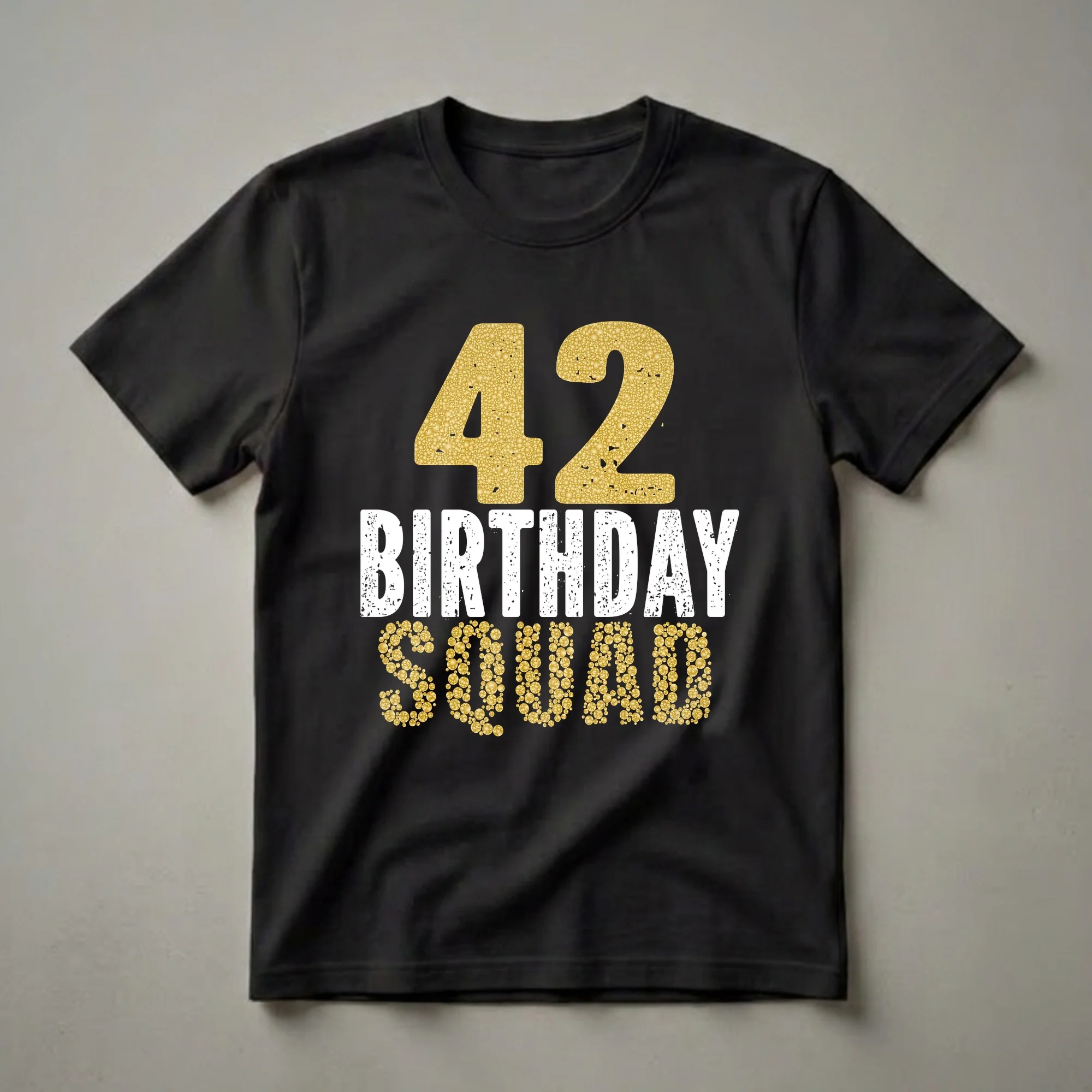 - Features a distressed white 'BIRTHDAY' and gold textured '42' and 'SQUAD'.