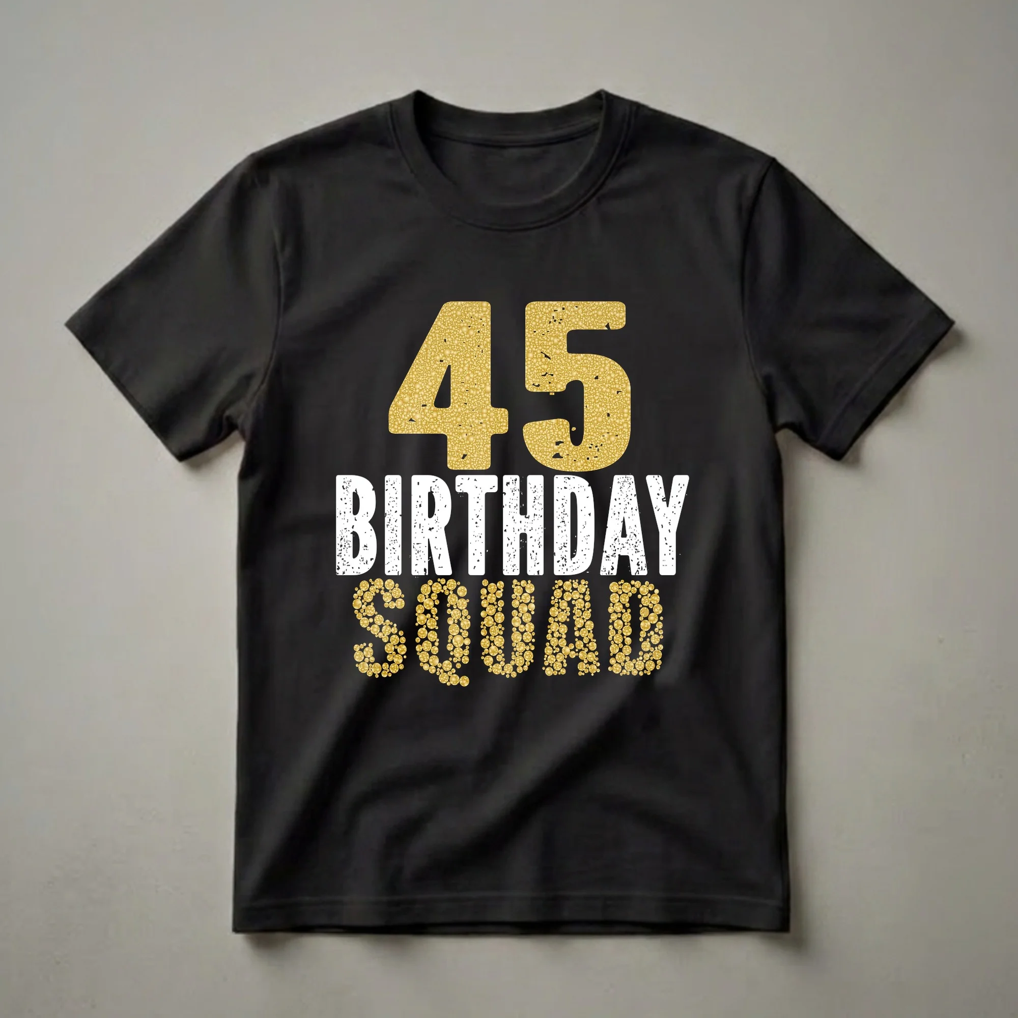 - Features '45 BIRTHDAY SQUAD' in distressed gold and white lettering.