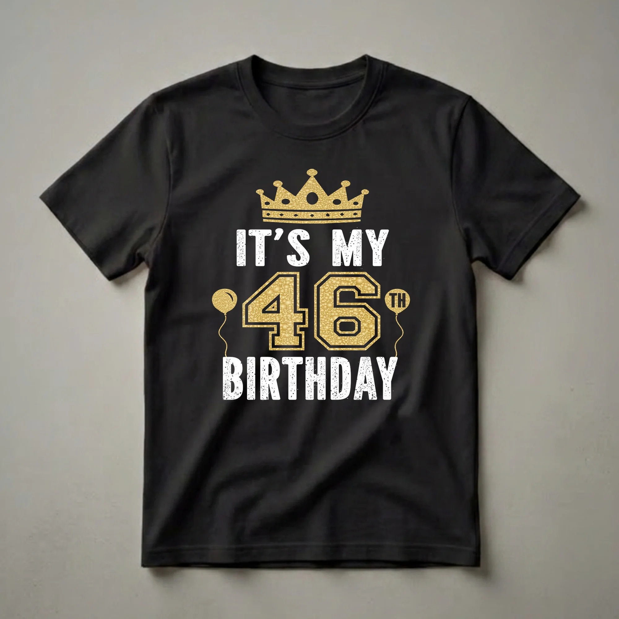 Turning 46 marks a significant milestone, a time to celebrate achievements and look forward to new adventures. This graphic tee is designed to commemorate that special day. The design prominently features a regal golden crown, symbolizing royalty and achievement, positioned above bold, distressed white text that reads "IT'S MY 46TH BIRTHDAY." Flanking the large "46" are two golden balloons, adding a festive touch. The number "46" itself is rendered in a shimmering gold texture, outlined in black, making it stand out against the black background of the shirt. The distressed white font for "IT'S MY" and "BIRTHDAY" adds a vintage, worn-in feel, suggesting a classic celebration. This t-shirt is a thoughtful gift for any man or woman celebrating their 46th birthday, whether it's for a birthday dinner, a party, or a casual get-together. It's a fun way for the birthday individual to express their milestone year and feel celebrated. This shirt works well for anyone who appreciates a bold graphic statement and wants to wear their birthday pride. It's a staple piece for any birthday celebration wardrobe, offering both style and a conversation starter. The design is straightforward yet impactful, ensuring the focus remains on the celebrated individual and their special day.