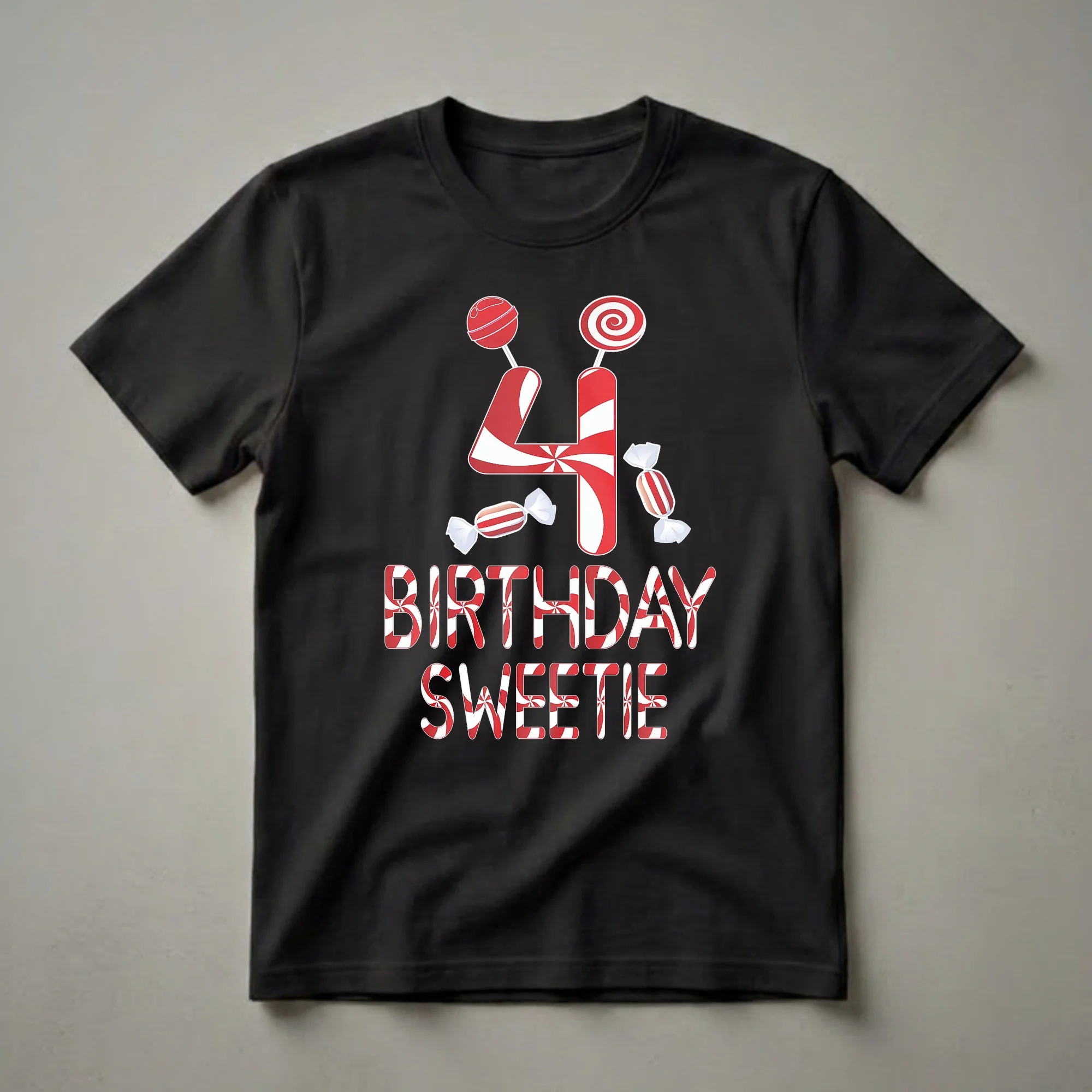 Four-year-olds are entering a vibrant stage of imagination and play, and this "Birthday Sweetie" tee captures that joyful spirit with its delightful candy theme. The graphic prominently displays a large number '4' rendered in a classic red and white peppermint stripe pattern, reminiscent of festive candy canes. Surrounding the number are whimsical elements like swirled lollipops and individually wrapped candies, all designed with the same sweet, sugary aesthetic. Below the number, the words "BIRTHDAY SWEETIE" are presented in bold, block letters, also featuring the eye-catching candy stripe design. This t-shirt is a thoughtful gift for any little girl turning four who loves sweets and bright, cheerful designs. It's a fun piece of apparel that makes a statement for a birthday party, a family gathering, or just a day out. The candy motif is universally appealing to young children, making this shirt a go-to choice for celebrating this special milestone. Imagine her excitement unwrapping this sweet treat on her big day, ready to show off her new birthday shirt.