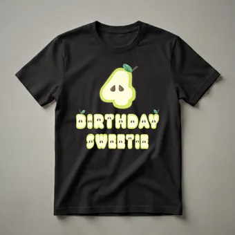 Turning four is a significant milestone, and this "Birthday Sweetie" tee captures the joy of the occasion with a playful fruit theme. The design features a large number '4' cleverly shaped like a slice of pear, complete with seeds and a stem, sitting above the words "BIRTHDAY SWEETIE." Each letter in the phrase is also designed to resemble slices of pear, showcasing their light yellow interior and green rind, with brown seeds visible within. This eye-catching graphic is a thoughtful choice for a 4-year-old girl celebrating her special day. Pears, known for their sweet flavor and juicy texture, are a delightful addition to any celebration, much like a birthday girl. This t-shirt makes a thoughtful gift for a child who loves fruity designs or is having a fruit-themed birthday party. She will reach for this shirt to wear to her birthday brunch or any festive gathering. It’s a fun way for her to express her excitement about turning four and to stand out on her big day.