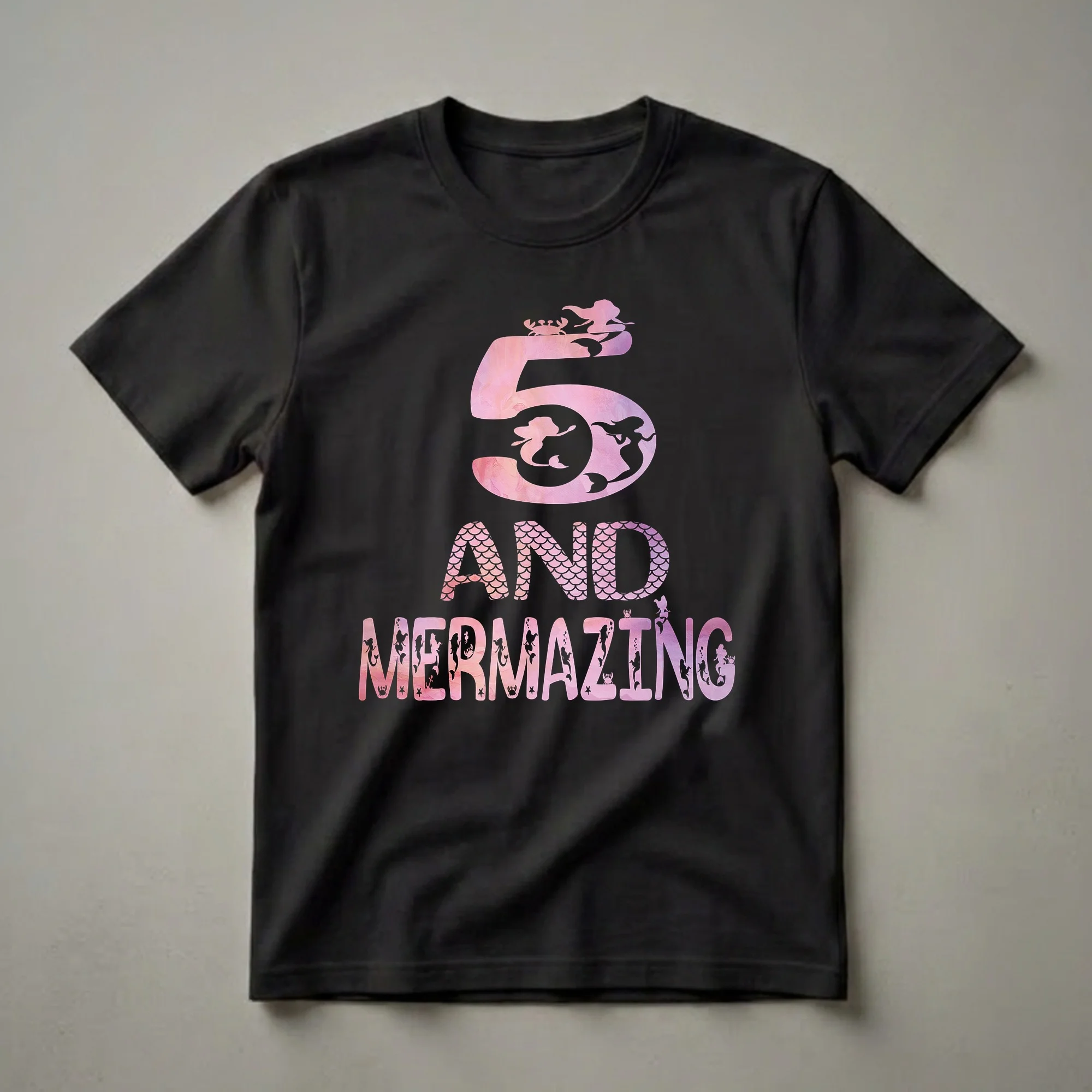 Girls turning five who dream of swimming with mermaids will want to wear this birthday tee to every party on the calendar. The design features a large number 5 rendered in a soft pink-to-purple watercolor wash, with small black silhouettes of mermaids and a crab floating inside the numeral. Below it, AND MERMAZING continues the theme in bold lettering filled with a fish-scale pattern and the same pink-purple gradient. The word MERMAZING itself is a playful mashup that turns the milestone age into its own brand, five and already mermazing. Mermaids have been a fixture of children's storytelling and fantasy for centuries, appearing in folklore from ancient Greece to the Caribbean, and modern culture has given them a starring role in everything from animated films to birthday party themes. A five-year-old girl is at exactly the right age to inhabit this world fully, old enough to love the mythology, young enough to believe in it completely. This shirt makes a thoughtful gift from a mom, aunt, or grandmother who wants to dress the birthday girl in something that matches her imagination. It works for a mermaid-themed birthday party, an aquarium visit, or any occasion where a girl wants to feel as fantastical as she actually is. Wear it to the party, the cake smash, or the family photo that everyone will look back on in twenty years.