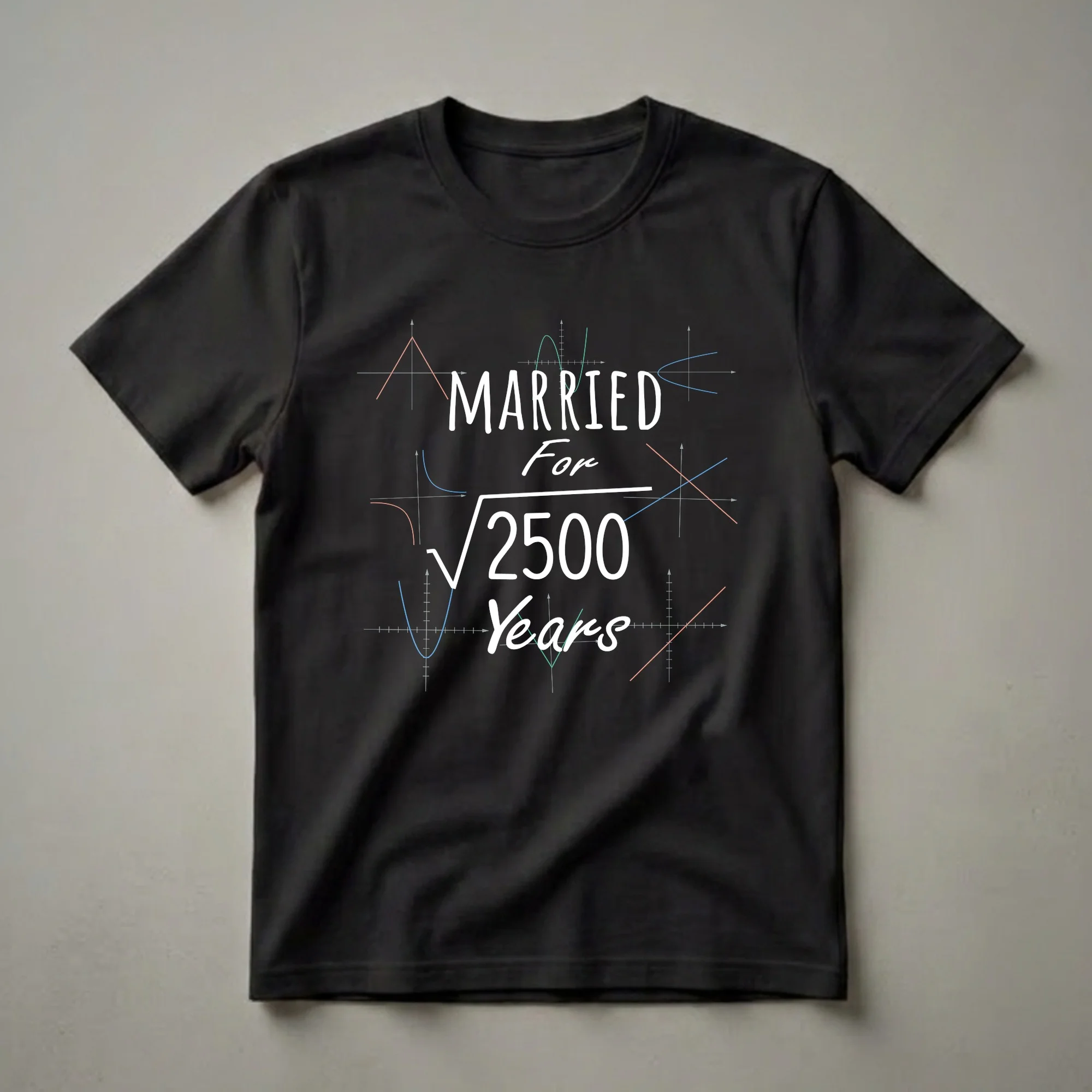 Couples celebrating their 50th wedding anniversary can showcase their enduring love with this distinctive math-themed t-shirt. The design boldly states 'MARRIED For √2500 Years', a clever mathematical representation of fifty years together, as the square root of 2500 equals 50. This eye-catching graphic tee is surrounded by various mathematical functions plotted on coordinate planes, including parabolas, hyperbolas, and linear equations, adding an intellectual flair to the celebratory message. This shirt is a thoughtful gift for the couple who appreciates a bit of wit and a nod to their shared journey through life's equations. It's a conversation starter, a thoughtful choice for anniversary dinners, parties, or casual wear as they reflect on half a century of partnership. The bold white lettering stands out against the black background, making the message clear and impactful. This unique piece of apparel is a fun way to commemorate a significant milestone, appealing to those with a fondness for mathematics or simply a good sense of humor about the passage of time in a long-lasting relationship. It's a staple for any couple marking this golden anniversary.