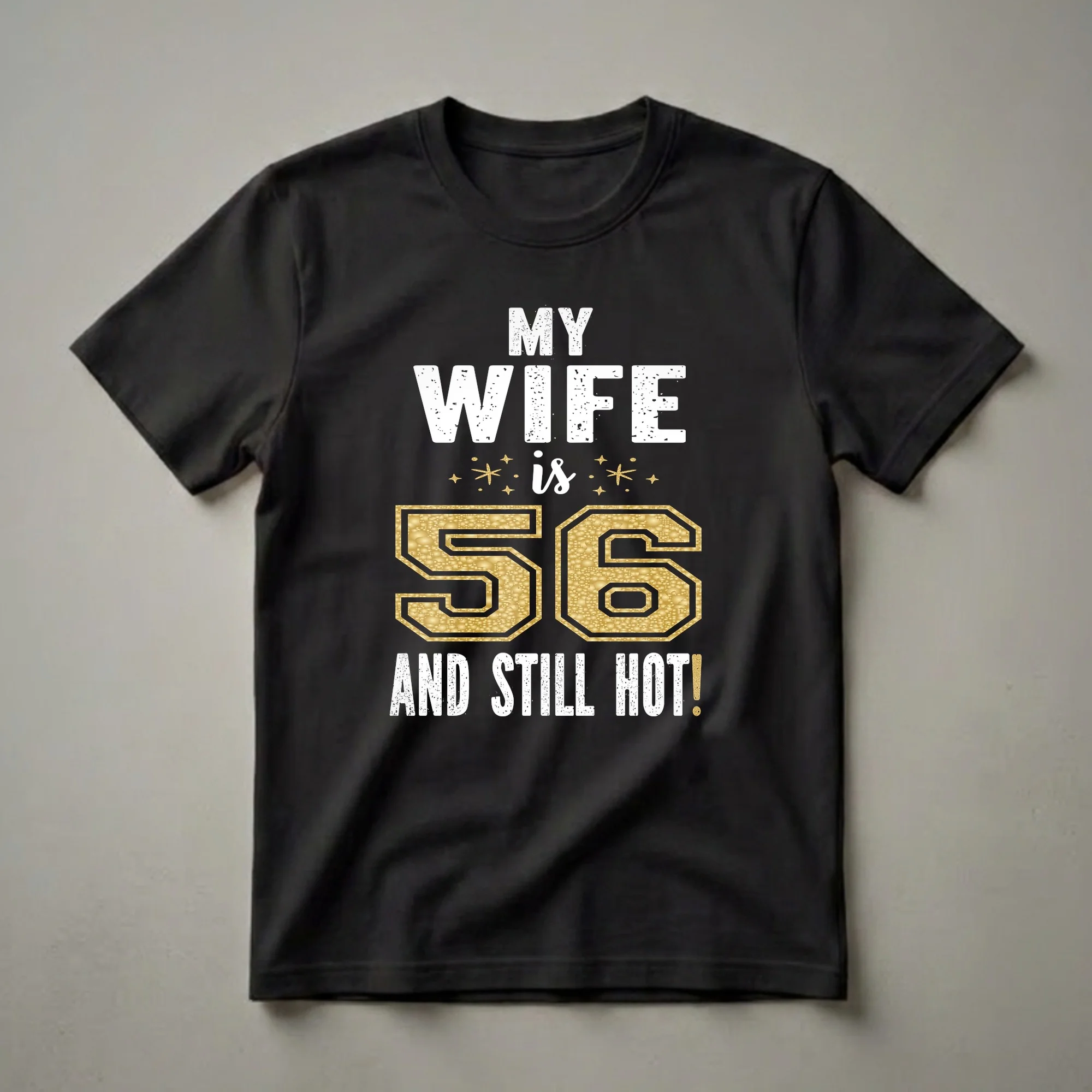 Fifty-six is a fantastic milestone, and this graphic tee celebrates a wife who is still turning heads. The design features bold, distressed white lettering that reads 'MY WIFE is' at the top, followed by a large, eye-catching '56' rendered in a shimmering gold texture with a black outline. Below the number, the phrase 'AND STILL HOT!' completes the statement in distressed white text, with a sparkling exclamation point. This t-shirt is a playful way for a husband to show appreciation for his wife on her 56th birthday, highlighting her enduring attractiveness. It's a thoughtful gift for any woman reaching this age who embraces it with confidence and a sense of humor. Imagine her wearing this shirt to a birthday dinner, a casual party, or even just around the house, bringing smiles and compliments. This shirt works well for wives, girlfriends, or any significant other celebrating this milestone birthday. It's a fun way to acknowledge her age while celebrating her vibrant spirit. This tee makes a thoughtful gift for your wife, ensuring she feels celebrated and cherished on her special day.