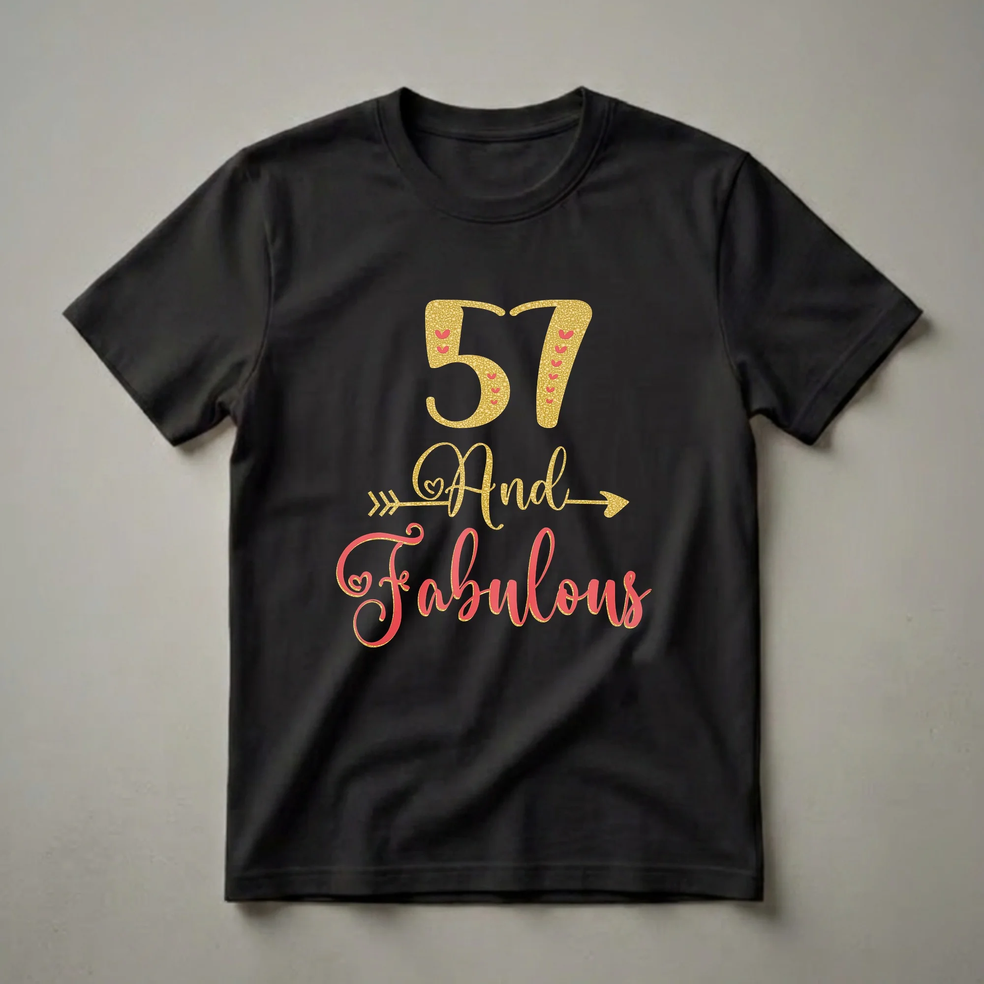 Women turning 57 will reach for this eye-catching birthday tee to celebrate their special day. The design features the number '57' in a shimmering gold glitter font, adorned with small red hearts. Below it, the phrase 'And Fabulous' is written in a stylish coral script, also with a subtle gold glitter outline and accented by decorative arrows. This shirt is a wonderful way for any woman to express her confidence and joy as she enters a new year. It makes a thoughtful gift for wives, mothers, sisters, or friends who are celebrating their 57th birthday. Imagine her wearing this vibrant t-shirt to a birthday brunch, a family gathering, or a casual get-together with friends. It's a fun and festive piece of apparel that highlights the milestone age with flair. This graphic tee is a staple in any birthday collection, offering a blend of sparkle and celebratory spirit. This apparel is a true conversation starter.