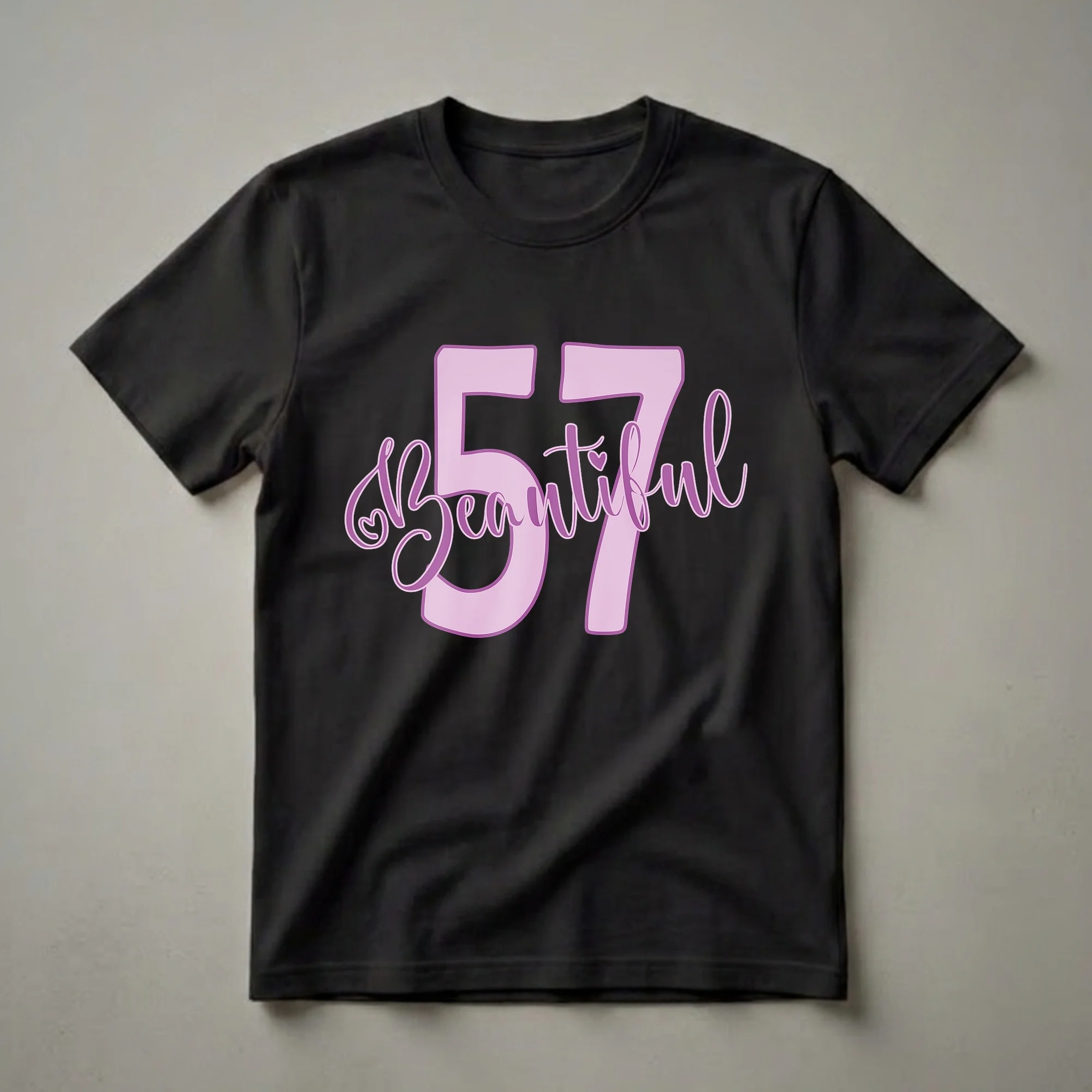 Women celebrating their 57th birthday will love this eye-catching graphic tee. The design prominently features the number 57 in a soft, light pink hue, outlined in a deeper shade of purple. Intertwined with the bold numerals is the word 'Beautiful,' rendered in an elegant, flowing script font in a complementary purple. Small heart accents add a touch of charm to the lettering, making this shirt a sweet and stylish statement piece. This t-shirt works well for women who appreciate a blend of classic and feminine design elements. It’s a thoughtful gift for any woman turning 57, whether it's for a milestone birthday party, a casual get-together with friends, or simply to wear as a daily reminder of her enduring beauty. The combination of the significant age and the positive affirmation creates a unique and personal piece of apparel. This shirt is a wonderful way for a woman to embrace her 57th year with confidence and flair, making it a go-to tee for birthday celebrations and beyond.