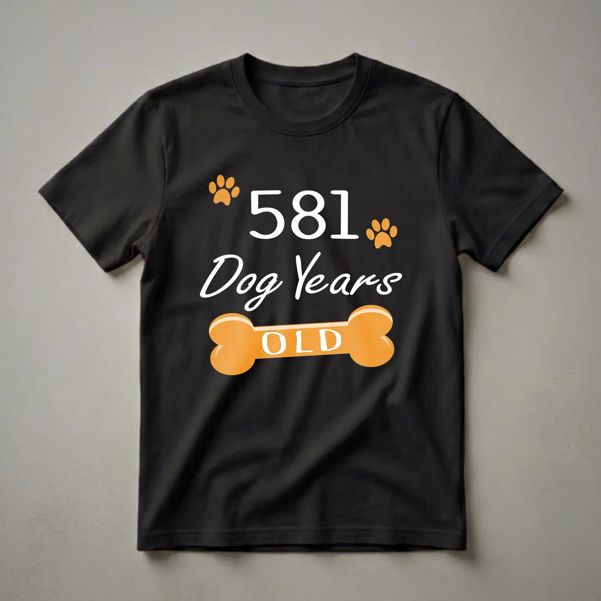 - Features '581 Dog Years Old' graphic with paw prints and a bone.