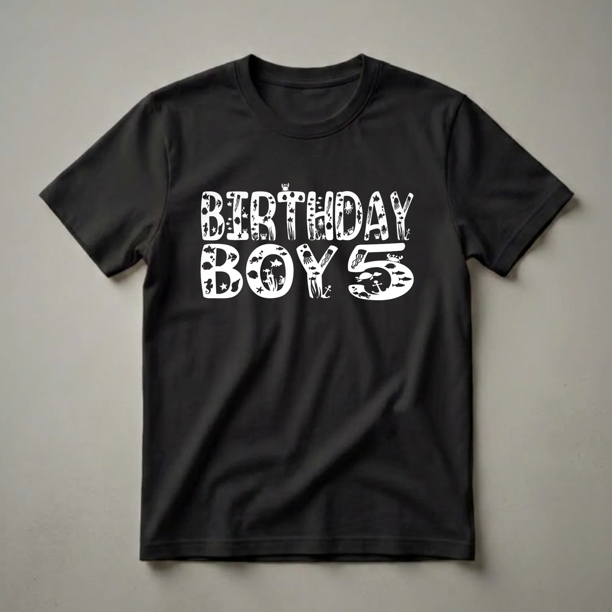 This unique t-shirt celebrates a 5th birthday with a playful underwater theme. The bold white text reads 'BIRTHDAY BOY 5', with each letter creatively filled with marine life. You'll spot schools of fish swimming, graceful jellyfish drifting, curious octopuses, and playful sea turtles. Crabs scuttle along coral, seahorses float by, and anchors rest on the seabed, all within the letters. This graphic tee is a fantastic way for a 5-year-old boy to showcase his special day. Five is a significant milestone, often marking the start of kindergarten or first grade, a time of growing independence and curiosity about the world. This shirt makes a thoughtful gift for any young boy turning five who has a fascination with the ocean, sea creatures, or fishing. Imagine him wearing this vibrant tee to his birthday party, a trip to the aquarium, or a day at the beach. It’s a fun piece of apparel that sparks conversation and excitement, making his fifth birthday celebration even more memorable. This shirt is a wonderful way to commemorate this exciting age.