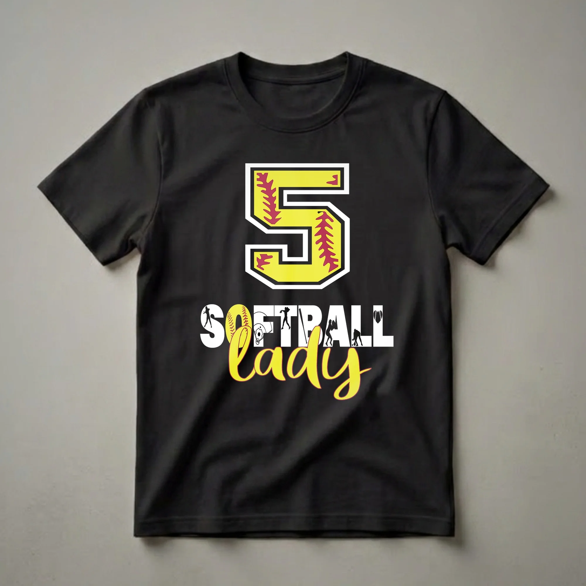- Features a large '5' and 'Softball Lady' graphic
