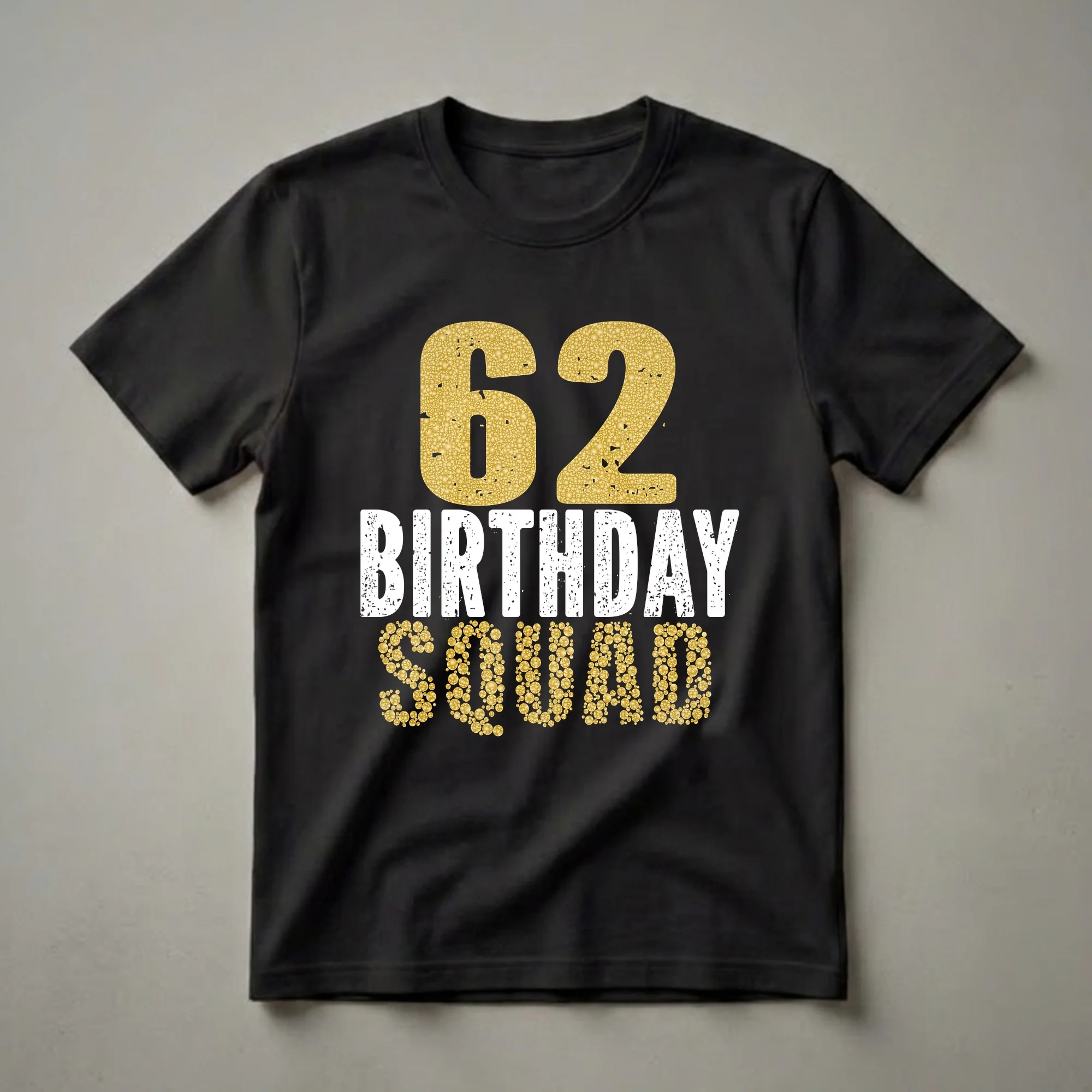 - Features bold '62' in gold and distressed 'BIRTHDAY SQUAD' text.