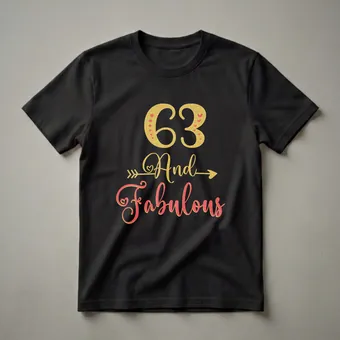 Women turning 63 can embrace their fabulousness with this eye-catching graphic t-shirt. The design features the number '63' in shimmering gold glitter, adorned with small red hearts. Below it, the word 'And' appears in elegant gold glitter, complete with a decorative arrow. The phrase is completed by 'Fabulous' in a vibrant coral glitter, also outlined in gold, and accented with a delicate heart. This tee is a wonderful way for any woman to mark her 63rd birthday, whether she's celebrating with family or friends. It makes a thoughtful gift for a wife, mother, or friend who is entering this milestone year with confidence and flair. Imagine her wearing this shirt to a birthday brunch, a casual get-together, or even just while enjoying a relaxed day at home. The combination of gold and coral glitter creates a festive and celebratory look, embodying the spirit of turning 63 and feeling absolutely fabulous. This shirt is a staple in any birthday collection for women who love to shine.