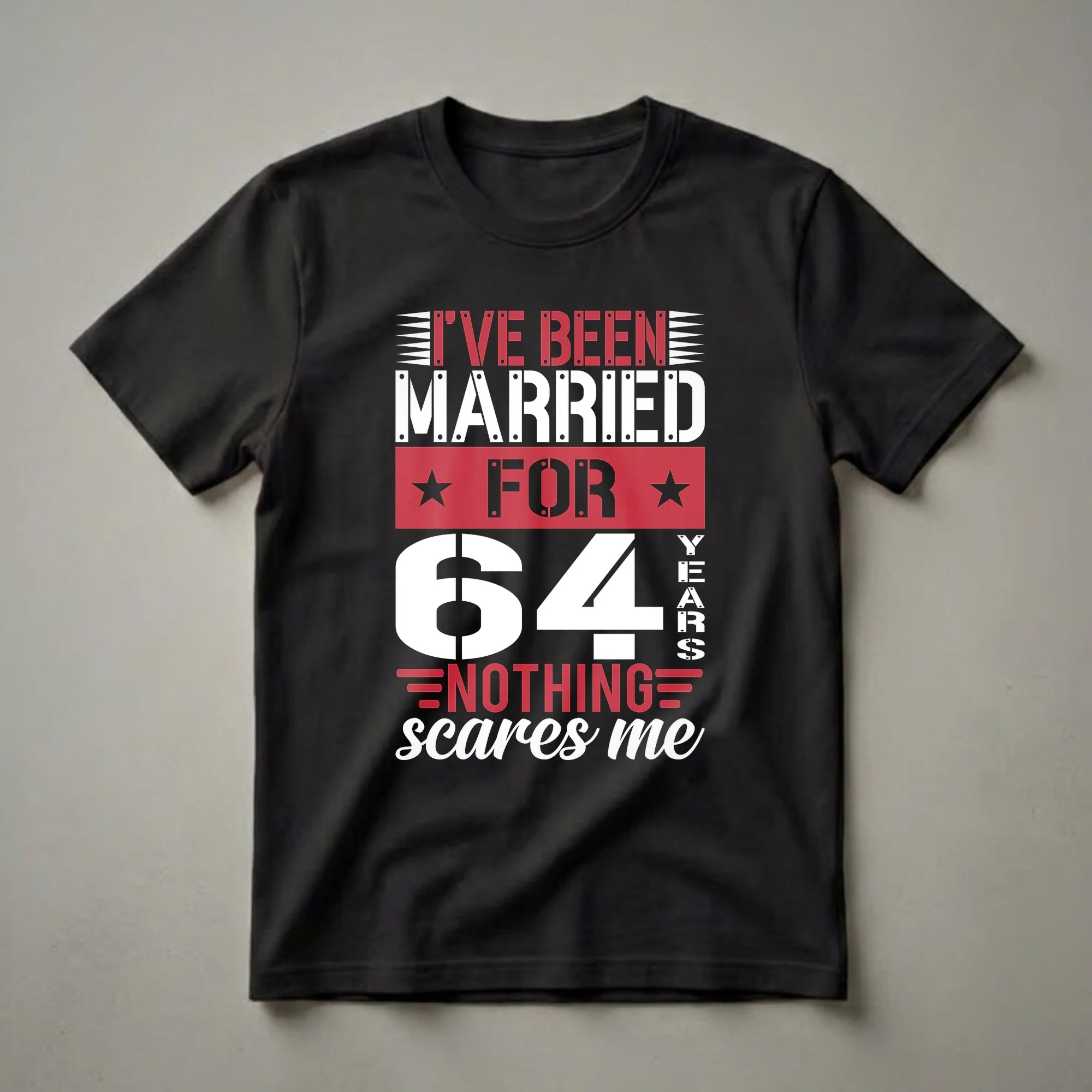 Sixty-four years of marriage is a remarkable milestone, a testament to enduring love and commitment. This graphic tee proudly proclaims, "I've Been Married For 64 Years Nothing Scares Me," a bold declaration for couples who have navigated nearly seven decades of life's adventures together. The striking design features large, stencil-style white numbers for '64' set against a red banner, with the accompanying text in bold white and red lettering. This shirt is a fantastic way for the husband or wife celebrating their 64th anniversary to showcase their long-lasting bond and the wisdom gained from years of partnership. It’s a conversation starter at anniversary parties, family gatherings, or even just a casual outing. This t-shirt works well for anyone who has reached this incredible marital achievement. Consider this tee as a thoughtful gift for your parents, grandparents, or any couple commemorating their 64th year together. It’s a wearable piece of pride for those who have truly seen it all and come out stronger.