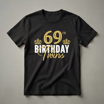 Twin brother and sister siblings who are celebrating their 69th birthday will reach for this eye-catching graphic tee. The design prominently features the number '69' in a shimmering gold glitter texture, signifying the milestone age. Above the number, 'TH' is displayed, indicating '69th'. Flanking the '69' are two ornate gold crowns, symbolizing royalty and celebration. Below the number, the words 'BIRTHDAY TWINS' are presented in a distressed white font, with 'Twins' written in a flowing, elegant gold script that mirrors the glitter effect of the numbers. This shirt is a thoughtful gift for any pair of twins turning 69, offering a fun way to commemorate their shared birthday. It's a great conversation starter for birthday parties, family gatherings, or casual outings, allowing them to proudly display their twin status and their significant birthday year. This t-shirt is a staple for anyone looking to celebrate this special occasion with a touch of sparkle and sibling pride. Wear it to a birthday brunch or a festive party to make the day even more memorable.