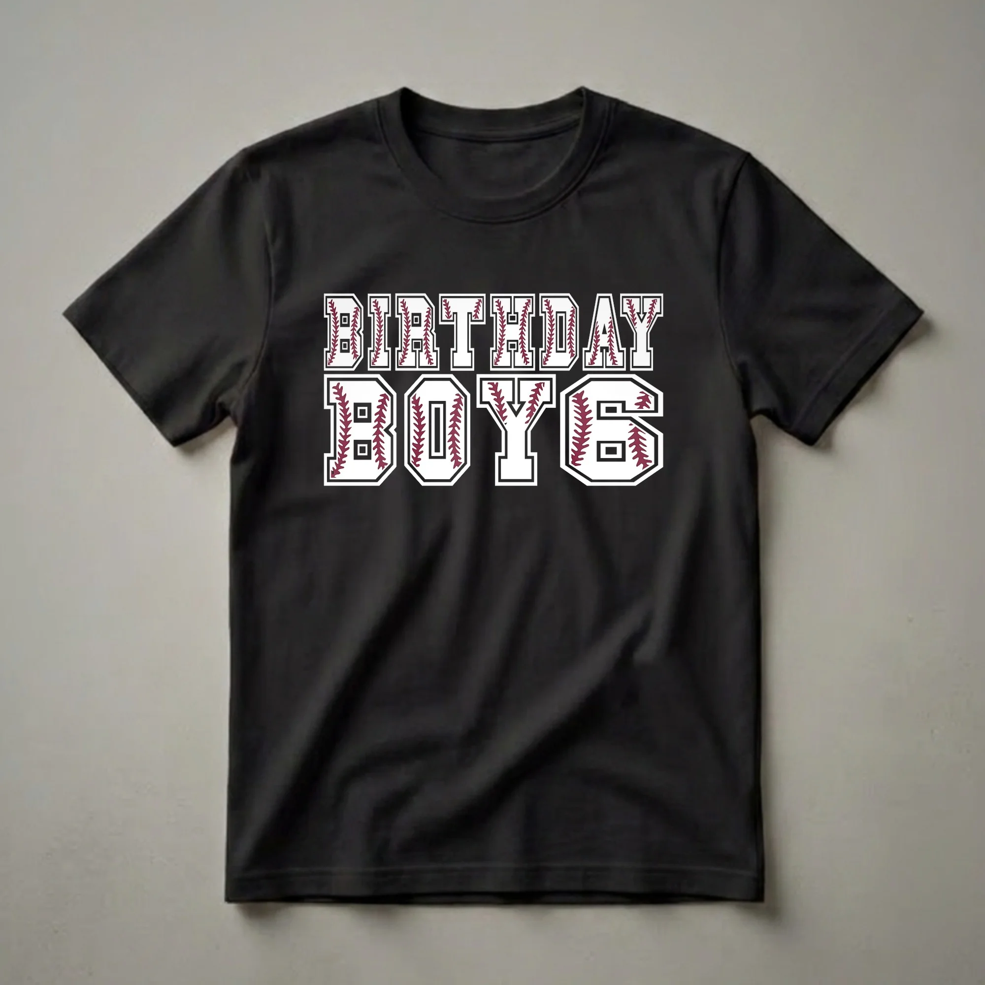 - "BIRTHDAY BOY 6" graphic tee for a 6-year-old.