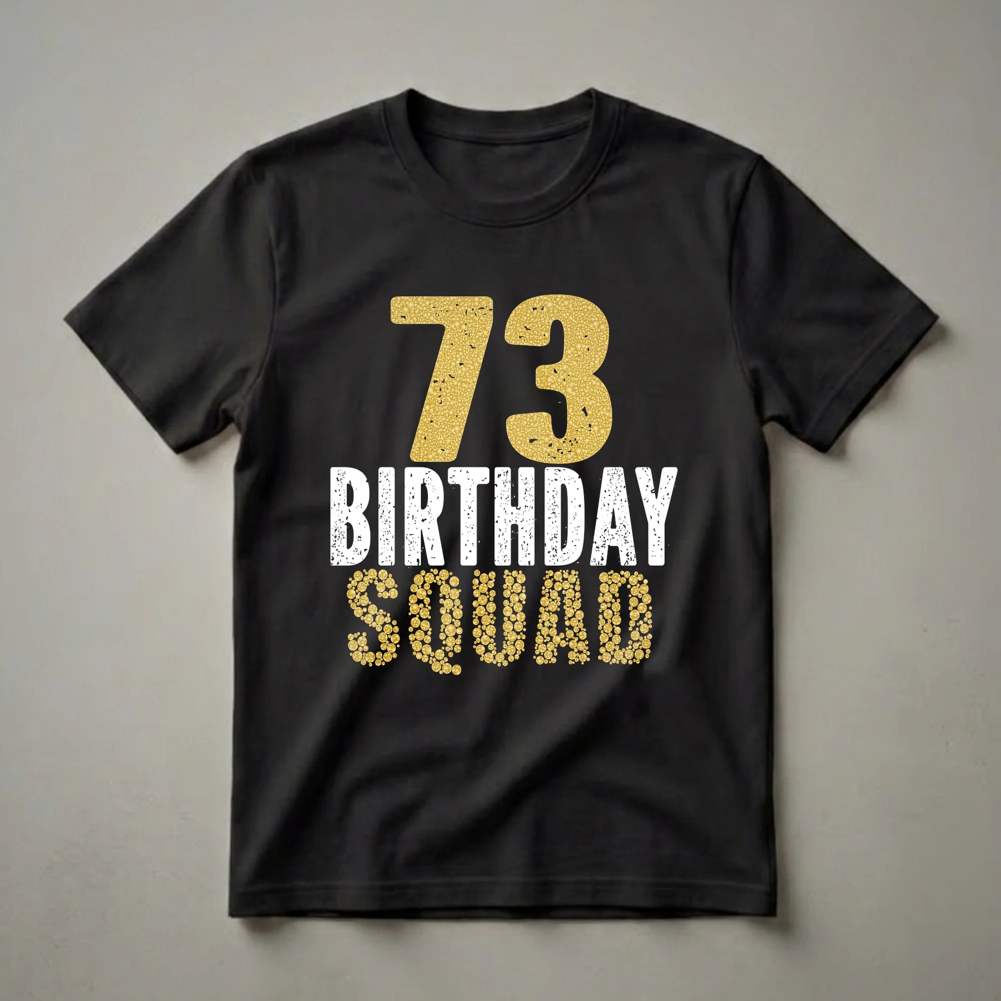 - "73rd Birthday Squad" graphic t-shirt for men and women turning 73.