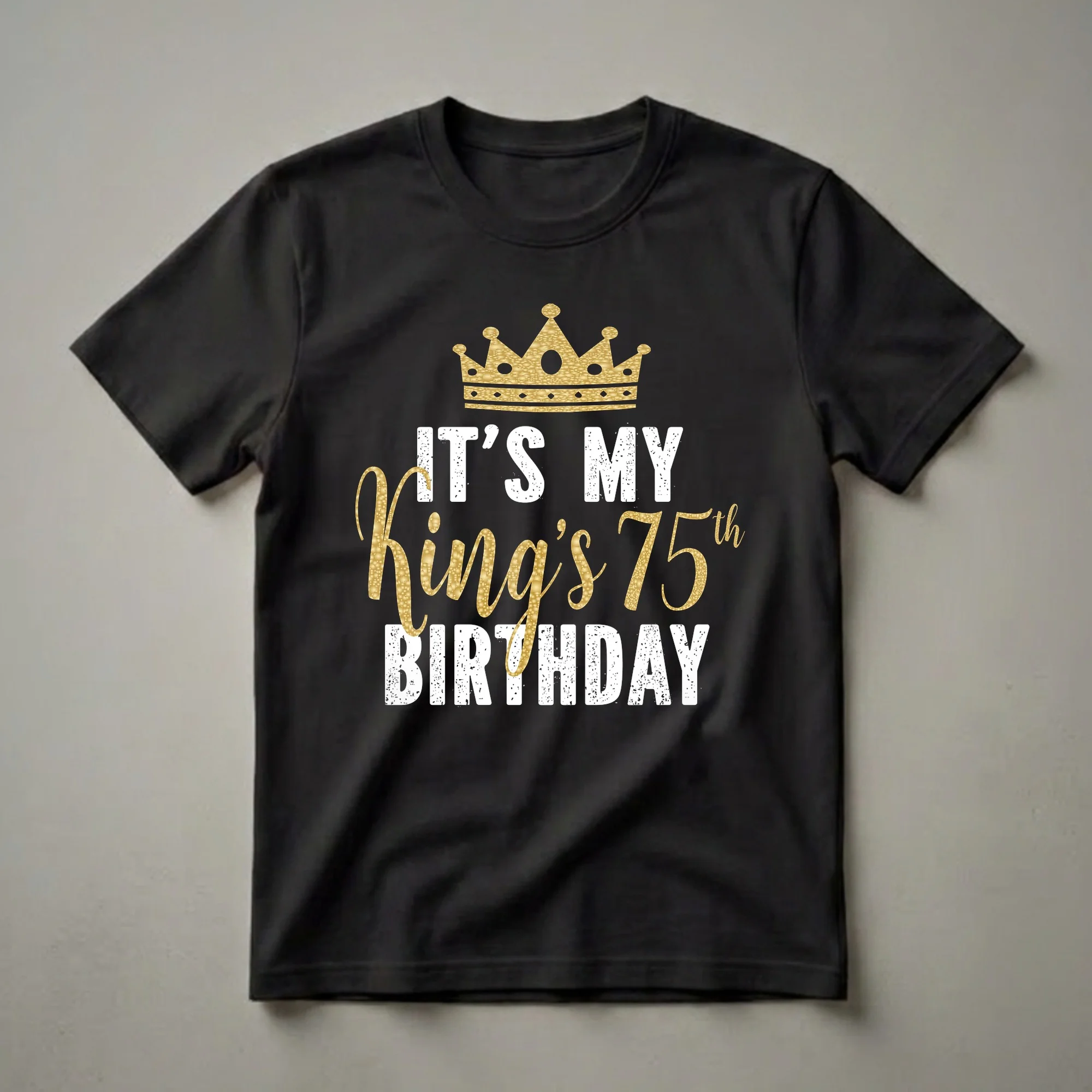 Seventy-five years is a significant milestone, marking three-quarters of a century. This graphic t-shirt celebrates that momentous occasion with a bold declaration. The design features a regal golden crown at the top, shimmering with a textured, glitter-like effect. Below the crown, the words "IT'S MY" are presented in a distressed, blocky white font, giving it a vintage feel. The centerpiece of the design is the word "King's" written in an elegant, flowing script, also in a dazzling gold texture. This script is juxtaposed with the prominent "75th" which is rendered in the same textured gold, emphasizing the age. Finally, "BIRTHDAY" is displayed in a distressed white block font, mirroring the "IT'S MY" text. This shirt is a fantastic way for a wife, daughter, or son to honor their king on his 75th birthday. It's a statement piece that announces his special day with pride and a touch of royalty. This tee works well for birthday parties, family gatherings, or casual celebrations. Imagine him wearing this to his birthday dinner, receiving compliments and well wishes. It makes a thoughtful gift for any man who is proud to reach this incredible age, offering a fun and celebratory way to mark his 75th year.