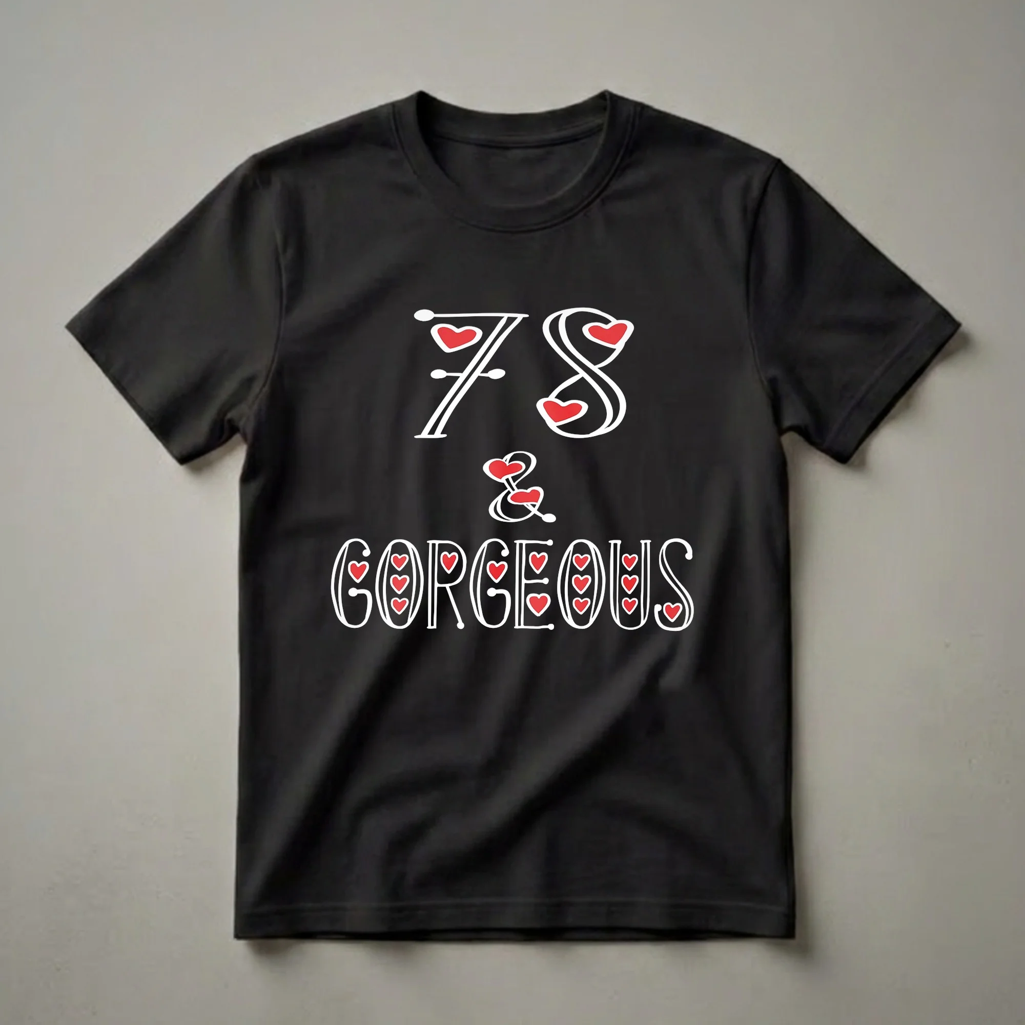 Women celebrating their 78th birthday deserve to feel as radiant as they are. This '78 & Gorgeous' graphic tee is designed to do just that, featuring bold white lettering accented with charming red hearts. The number 78 is playfully styled, with each digit incorporating a heart, and the word 'GORGEOUS' is similarly adorned, making the entire design pop against the black background. Turning 78 is a significant milestone, a testament to a life lived with grace and experience. This shirt serves as a wonderful reminder of that enduring beauty and spirit. It’s a thoughtful gift for the woman in your life who is embracing her 78th year with confidence and style. Imagine her wearing this comfortable tee to her birthday brunch or a casual gathering with friends and family, radiating joy and elegance. This t-shirt is more than just apparel; it's a statement piece that celebrates a woman's continued vibrancy and charm as she enters this new chapter. It’s a go-to tee for any woman who believes age is just a number and beauty is timeless.