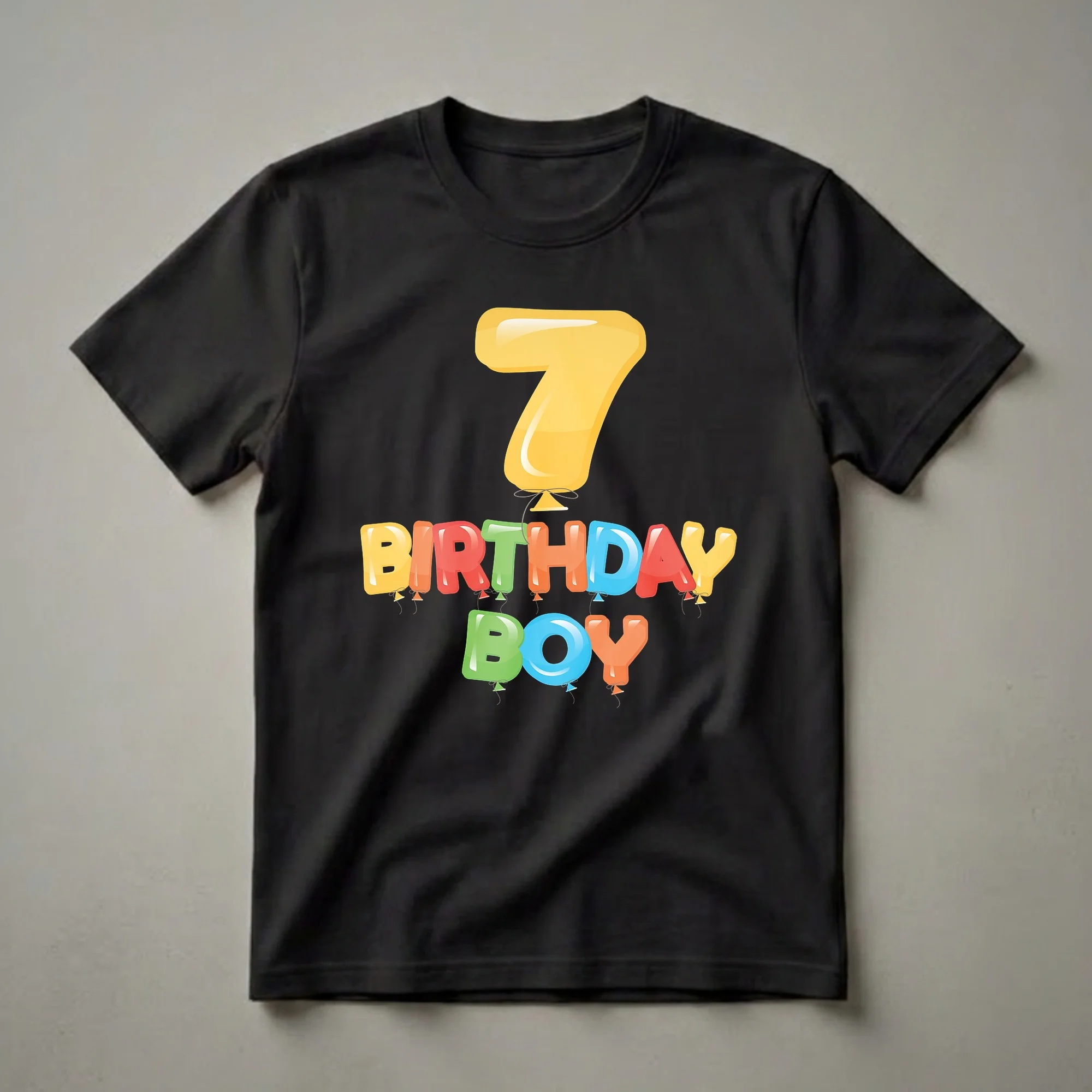 Seven-year-old boys are entering a new phase of childhood, often with a growing sense of independence and a love for vibrant celebrations. This festive birthday boy t-shirt captures that excitement with its playful design. The graphic features a large, glossy yellow balloon shaped like the number 7, floating above colorful, balloon-like letters that spell out "BIRTHDAY BOY." Each letter is rendered in a different bright hue, red, orange, green, and blue, mimicking the look of inflated balloons tied with strings. This eye-catching tee is a fantastic way for any boy turning seven to showcase his milestone birthday. It’s a staple for birthday parties, family gatherings, or even just a fun day out. Imagine him wearing this shirt to his birthday party, surrounded by friends and family, ready to celebrate another year. This shirt makes a thoughtful gift for any 7-year-old boy who loves bright colors and fun designs, ensuring he feels special on his big day. It's a go-to tee for making birthday memories.