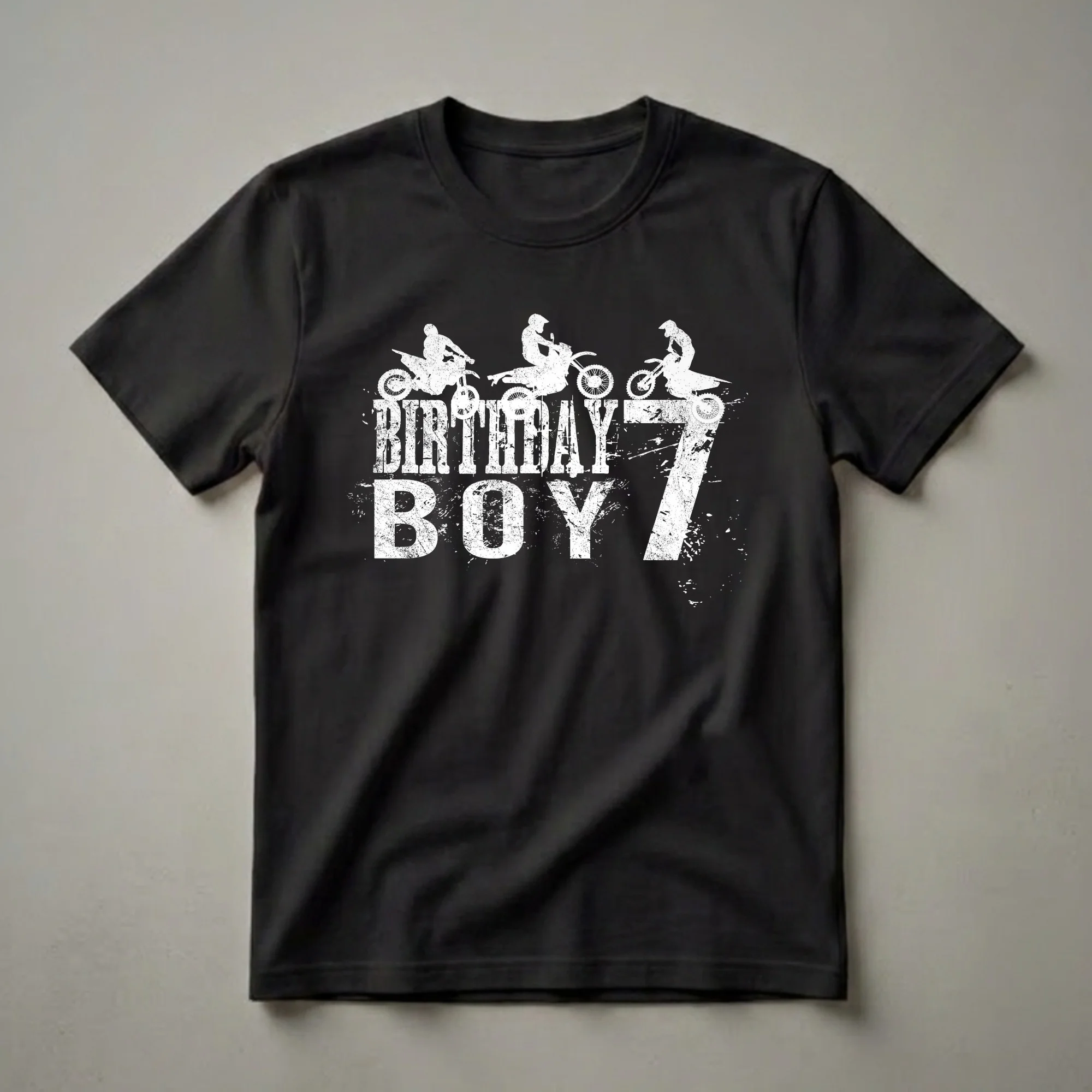 - Seven-year-old boys will love this dirt bike tee for their 7th birthday party.