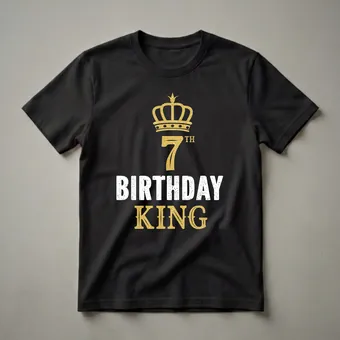 Seven-year-old boys are entering a new phase of childhood, often developing more complex interests and a stronger sense of self. This 'Birthday King' t-shirt captures that celebratory spirit. The design prominently features a glittering golden crown atop a large, stylized number '7', signifying the milestone age. Below the number, the words 'BIRTHDAY KING' are displayed in bold, distressed white lettering, with 'KING' also rendered in a textured gold. This graphic tee is a fantastic way for a seven-year-old boy to feel special on his big day. It's a thoughtful gift for parents, grandparents, aunts, or uncles looking for a unique present for the birthday boy. Imagine him wearing this shirt to his birthday party, opening gifts, or enjoying cake with friends and family. This shirt works well for any boy turning seven, celebrating his royal status for the day. It's a fun piece of apparel that he'll reach for to show off his age and his kingly title.