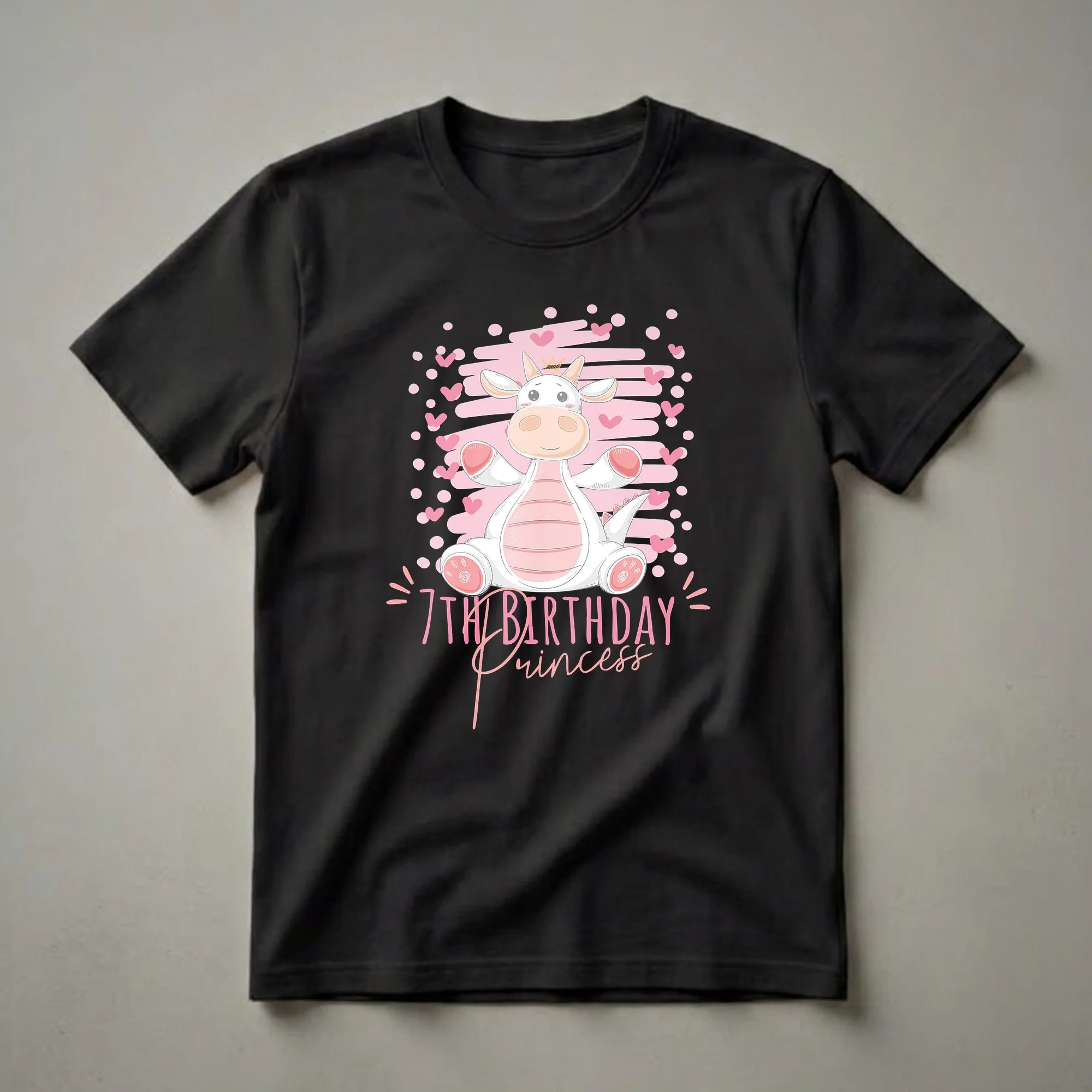 Seven-year-old girls who adore mythical creatures and fairy tales will love this charming birthday princess tee. The graphic features a cute, white cartoon dragon with a golden crown perched on its head, sitting playfully amidst a backdrop of soft pink stripes and scattered pink hearts. This eye-catching design is specifically for girls celebrating their seventh birthday, marking a significant milestone as they transition further into their childhood years. The text "7th Birthday Princess" is prominently displayed in a playful, script-like font, making it clear this shirt is meant for the birthday girl. This t-shirt is a thoughtful gift for any 7-year-old who dreams of dragons and royalty. It’s a wonderful way for her to express her personality on her special day, whether she's opening presents, enjoying cake, or celebrating with friends and family. Imagine her delight when she unwraps this unique birthday apparel, ready to wear her princess title with pride.