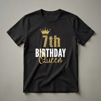 - Features a glittery gold crown and '7th Birthday Queen' text.