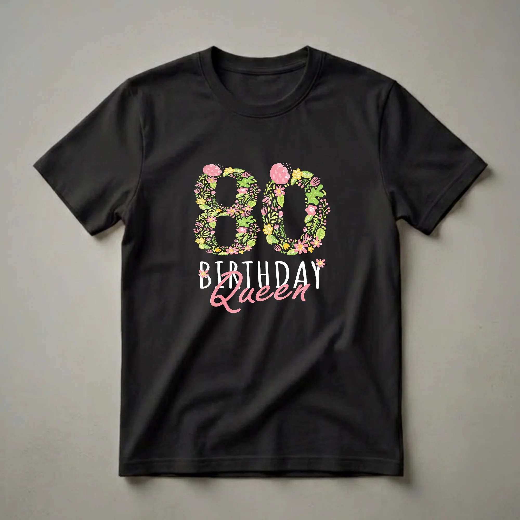 - Floral '80' Birthday Queen t-shirt for women turning 80.