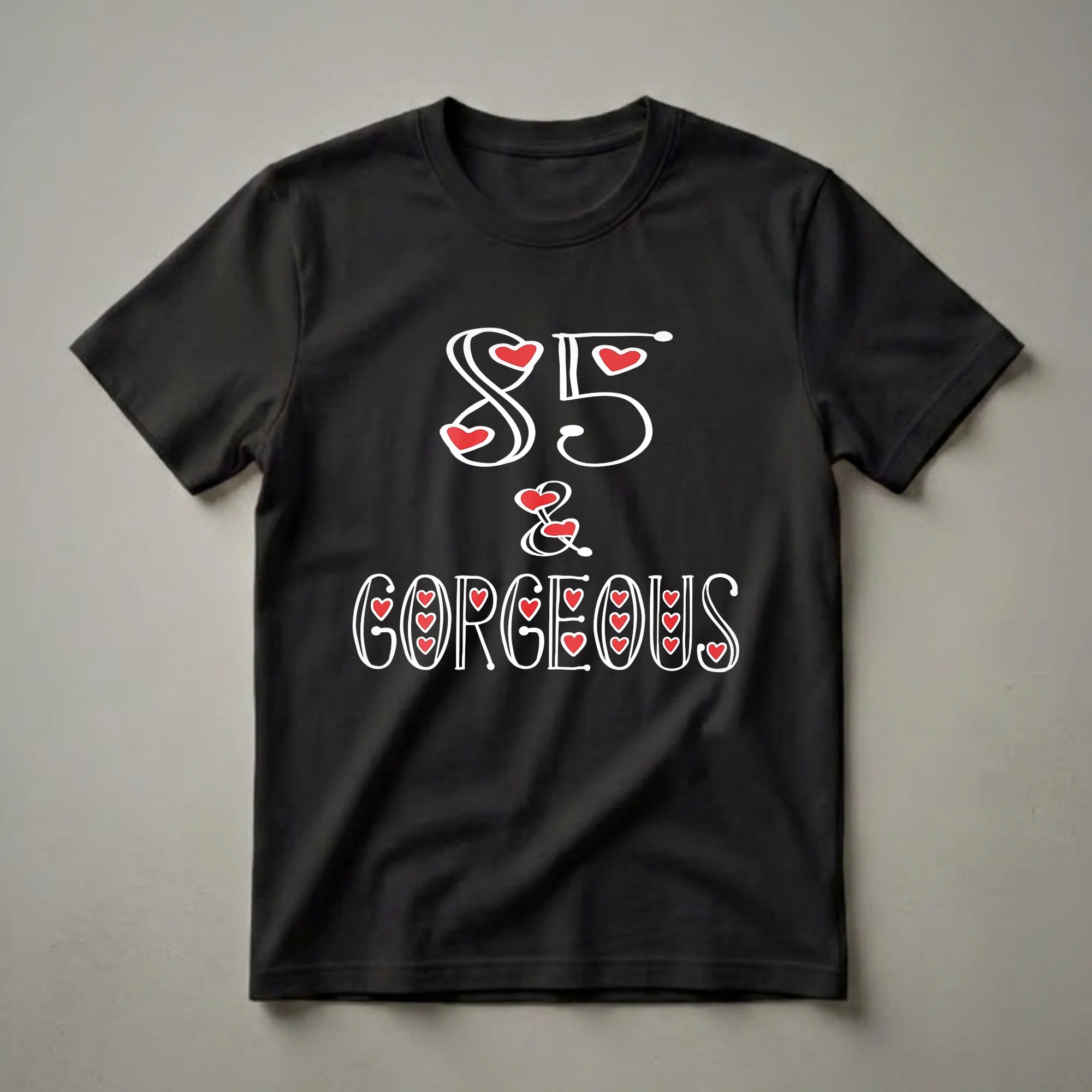 Turning 85 is a remarkable milestone, and this '85 & Gorgeous' graphic tee is a wonderful way to celebrate. The design features bold, stylized white lettering with playful red heart accents, spelling out '85 & GORGEOUS'. This eye-catching t-shirt is specifically for women celebrating their 85th birthday, offering a fun and fashionable statement piece. It's a thoughtful gift for grandmothers, mothers, or any special woman in your life who is embracing this significant age with style and grace. Imagine her wearing this comfortable tee to her birthday brunch or a family gathering, radiating confidence and joy. This shirt serves as a vibrant reminder that age is just a number, and beauty truly is timeless. It’s a perfect addition to her birthday celebration attire, making the occasion even more memorable. This birthday shirt is a fantastic way to honor her journey and celebrate her enduring spirit. She will reach for this tee often.