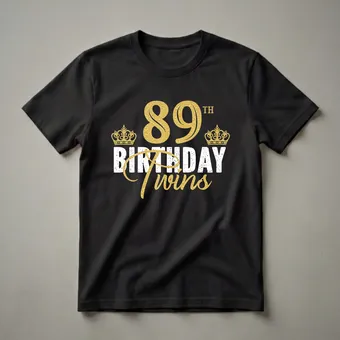 Twin brother and sister celebrating their 89th birthday will reach for this eye-catching tee. The design prominently features the number '89' in a shimmering gold glitter texture, accompanied by 'TH' and two ornate gold crowns, symbolizing royalty and a significant milestone. Below, the words 'BIRTHDAY Twins' are presented in a distressed white font, creating a vintage yet celebratory feel. This graphic shirt is a fantastic way for siblings who share the same birthday to commemorate nearly nine decades of life together. It serves as a unique gift idea for the twin brother and sister who have shared countless memories and experiences. Imagine them wearing this special t-shirt to a joint birthday brunch or family gathering, a testament to their enduring bond. This apparel is more than just clothing; it's a wearable celebration of a shared life journey, marking 89 years of togetherness. It's a statement piece for anyone who cherishes their twin connection and wants to celebrate this remarkable age with style and pride.