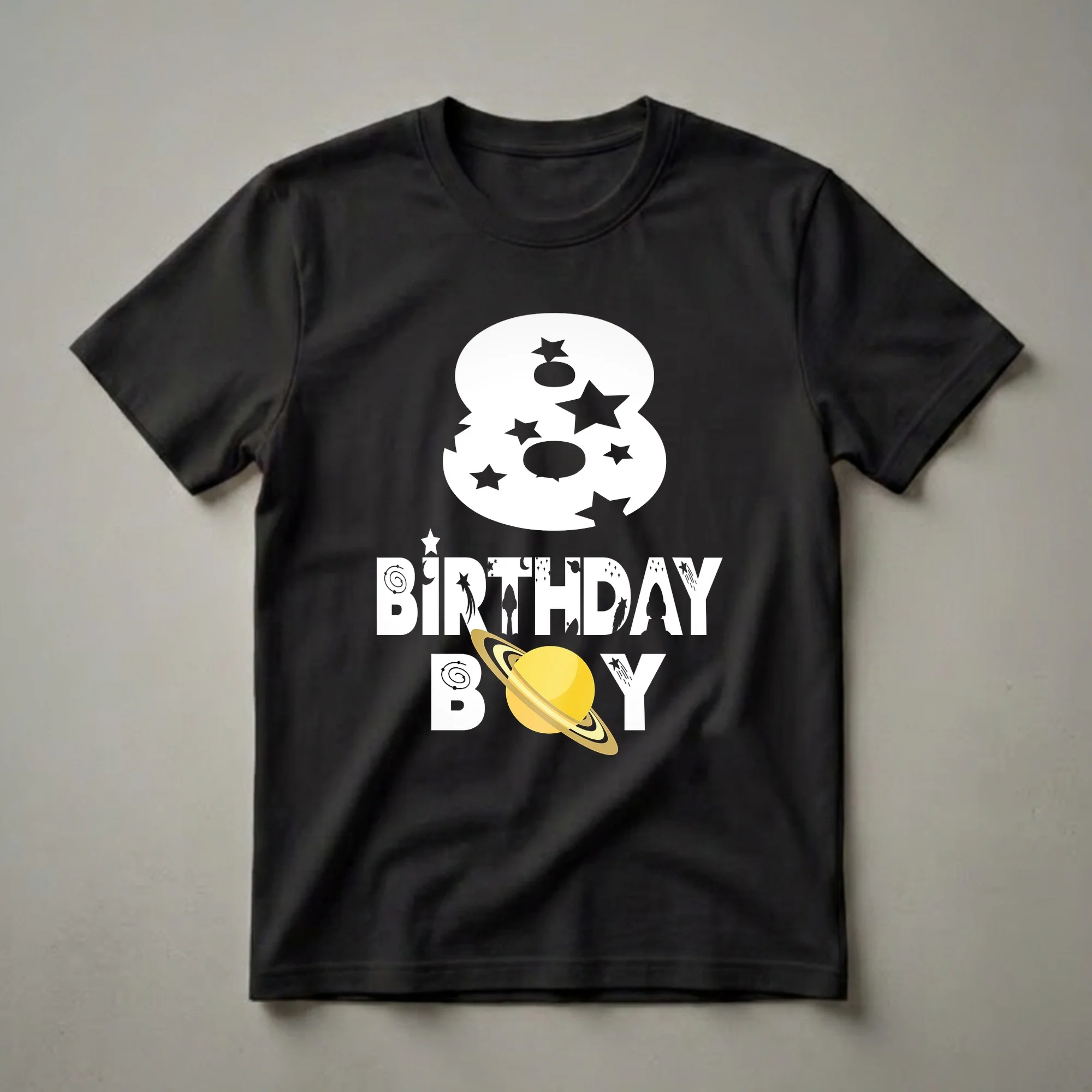 Eight-year-old boys who dream of exploring the cosmos will love this "Birthday Boy" astronaut t-shirt. The design prominently features a large white number '8' filled with playful stars and a speech bubble, symbolizing the excitement of turning eight. Below it, the words "BIRTHDAY BOY" are emblazoned in bold white lettering, accented by a vibrant yellow Saturn with its iconic rings. Scattered throughout the design are additional celestial elements like rockets, moons, and swirling galaxies, evoking a sense of adventure and space exploration. This graphic tee is a fantastic way for any young explorer to celebrate their special day, whether at a birthday party, a family gathering, or just out and about. It makes a thoughtful gift for any 8-year-old boy who is fascinated by space, astronauts, and the universe. Imagine his excitement when he unwraps this stellar shirt, ready to embark on his next year of adventures. This t-shirt is a staple for any young astronaut's wardrobe, made for making his 8th birthday truly memorable.