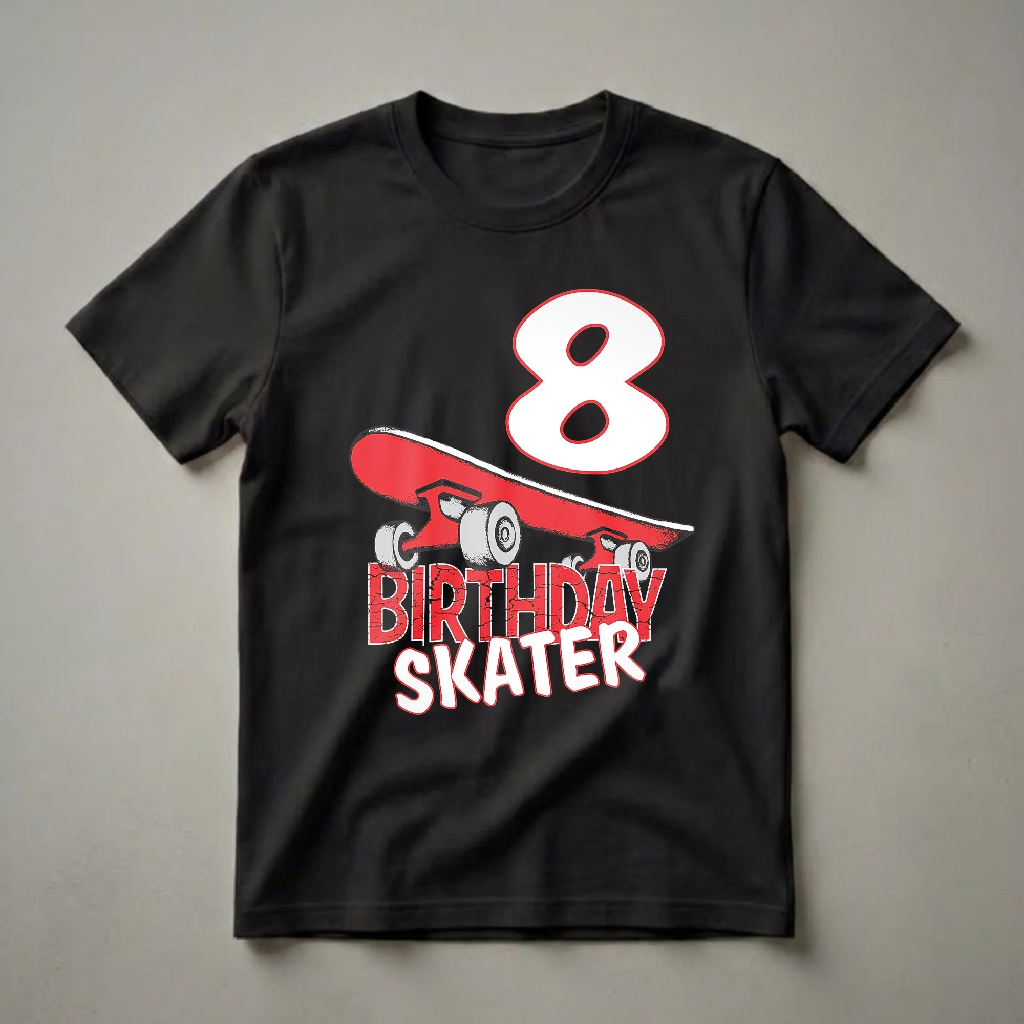 - Features a cool red skateboard graphic and distressed "BIRTHDAY SKATER" text.