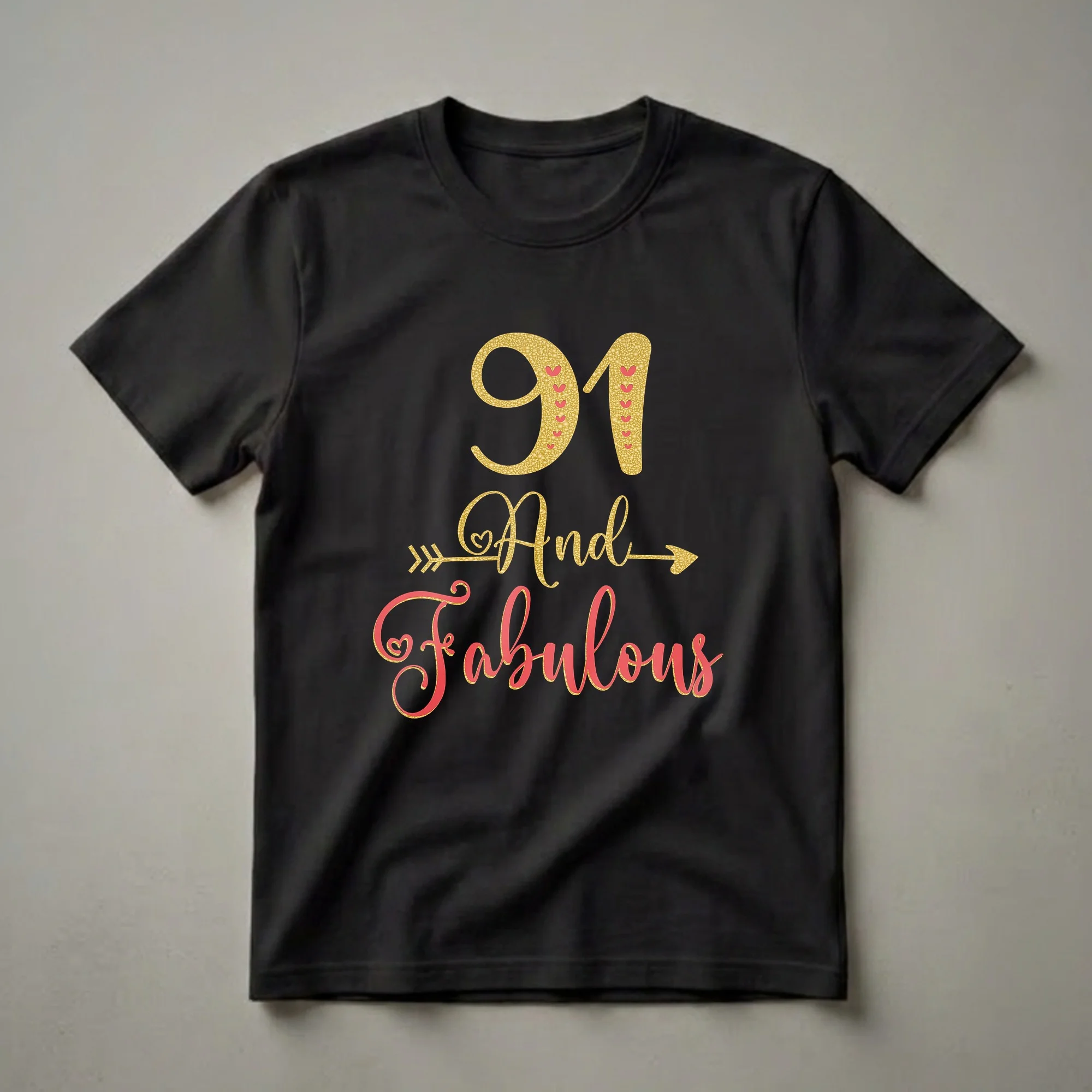 Grandmothers celebrating their 91st birthday deserve a shirt that shines as brightly as they do. This eye-catching graphic tee proudly displays '91 And Fabulous' in a dazzling combination of gold glitter texture and vibrant coral script, outlined with shimmering gold. The number '91' is adorned with small, charming red hearts, while a decorative gold arrow pierces through the word 'And', adding a touch of playful elegance. This t-shirt is a wonderful way for any woman to mark this significant milestone, embracing her ninety-first year with style and confidence. It makes a thoughtful gift for a grandma who is celebrating her birthday, perhaps to wear to a family gathering or a special birthday brunch. The design is printed on a black shirt, making the gold and coral elements pop. This shirt is a fantastic way to honor ninety-one years of life, wisdom, and fabulousness, ensuring the birthday queen feels celebrated and cherished on her special day. It's a staple piece for any wardrobe celebrating a major birthday.